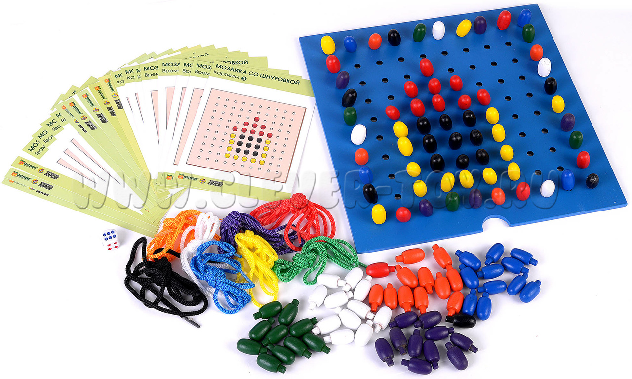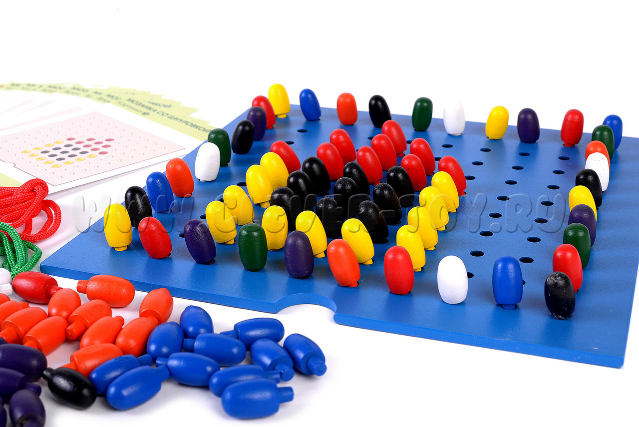 Комплектация: планшет 25*25 см – 1 шт., фишки – 120 шт. (по 15 шт. 8 цветов), шнурки разноцветные – 8 шт., опорные карточки – 20 шт., кубик игральный – 1 шт., руководство по эксплуатации – 1 шт.