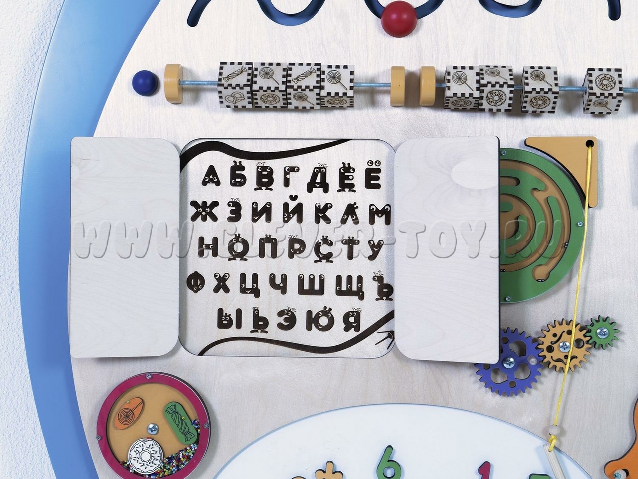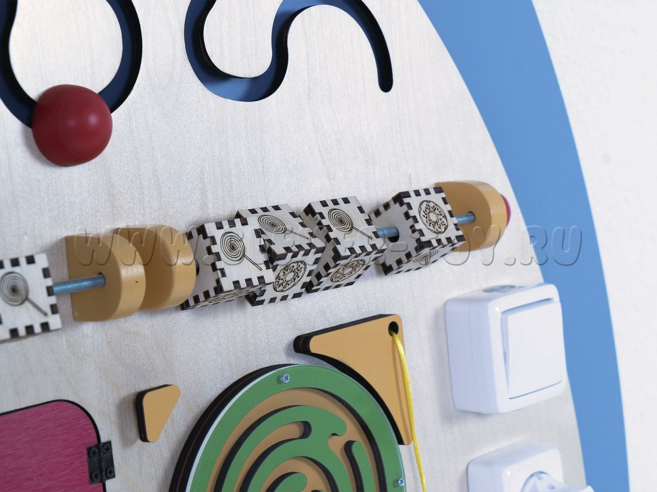 Бизиборд "Зёва" предназначен для детских образовательных учреждений и помогает изучать геометрические фигуры (форму, количество углов, вид, цвет и особенности). Задания составлены по принципу "от простого к сложному". Например, при изучении геометрических фигур можно тренироваться в счёте, определяя количество углов. Также можно рисовать запомнившиеся фигуры или играть в крестики-нолики, вращая фигуры.