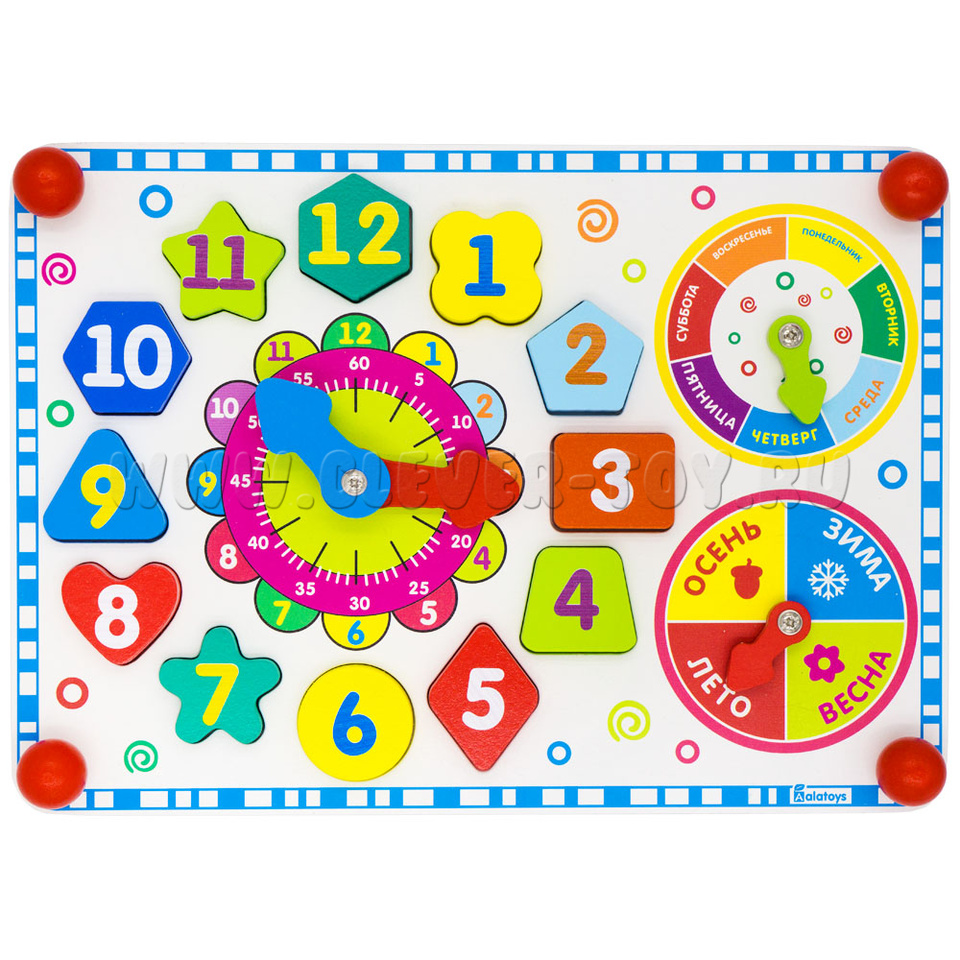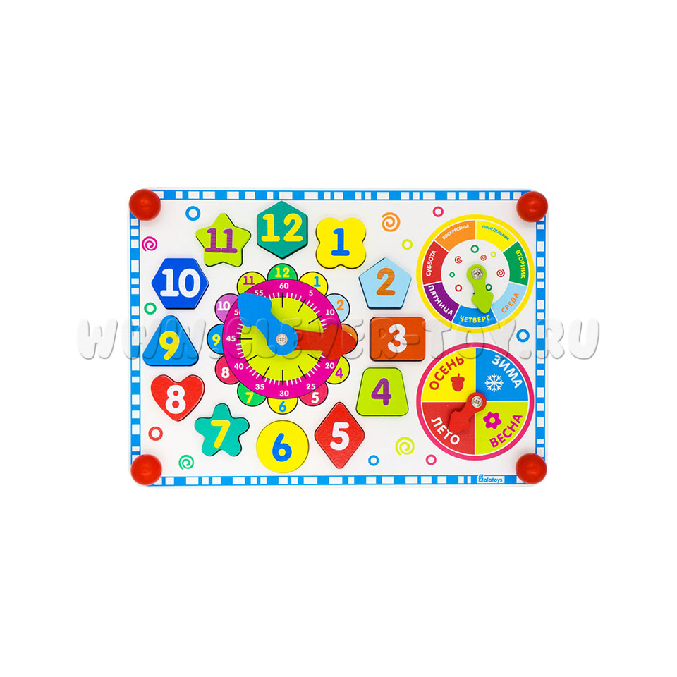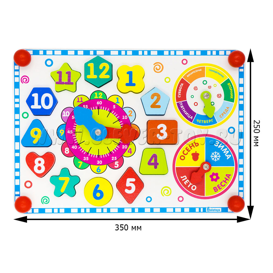 Фигуры расположены вокруг циферблата. С обозначением цифр от 1 до 12, разной формы и разных цветов. Поможет малышу познакомиться с геометрическими фигурами, развить логику, мелкую моторику. - Держатели-шарики по углам 4 шт.