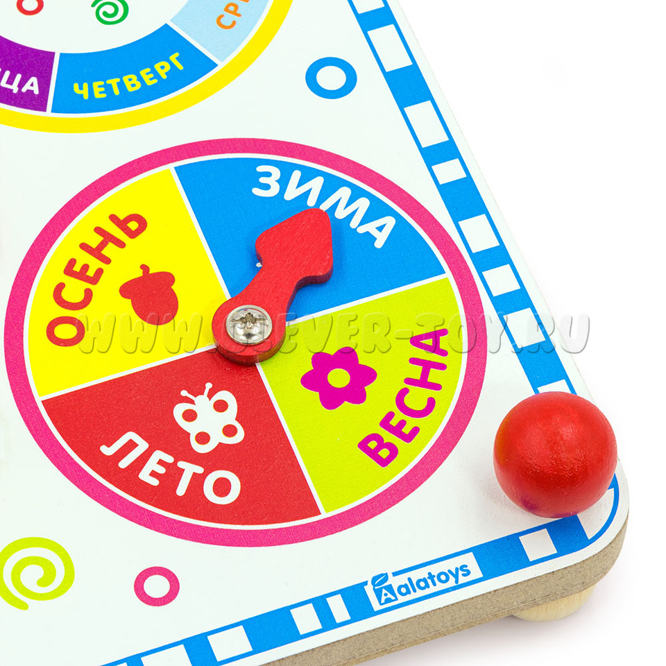Разделён по дням недели, каждый день обозначен своим цветом: понедельник – жёлтый, вторник – зелёный, среда – голубой, четверг – синий, пятница – фиолетовый, суббота – красный, воскресенье – оранжевый. В центре круга – вращающаяся стрелка-указатель. - Сектор «Времена года».