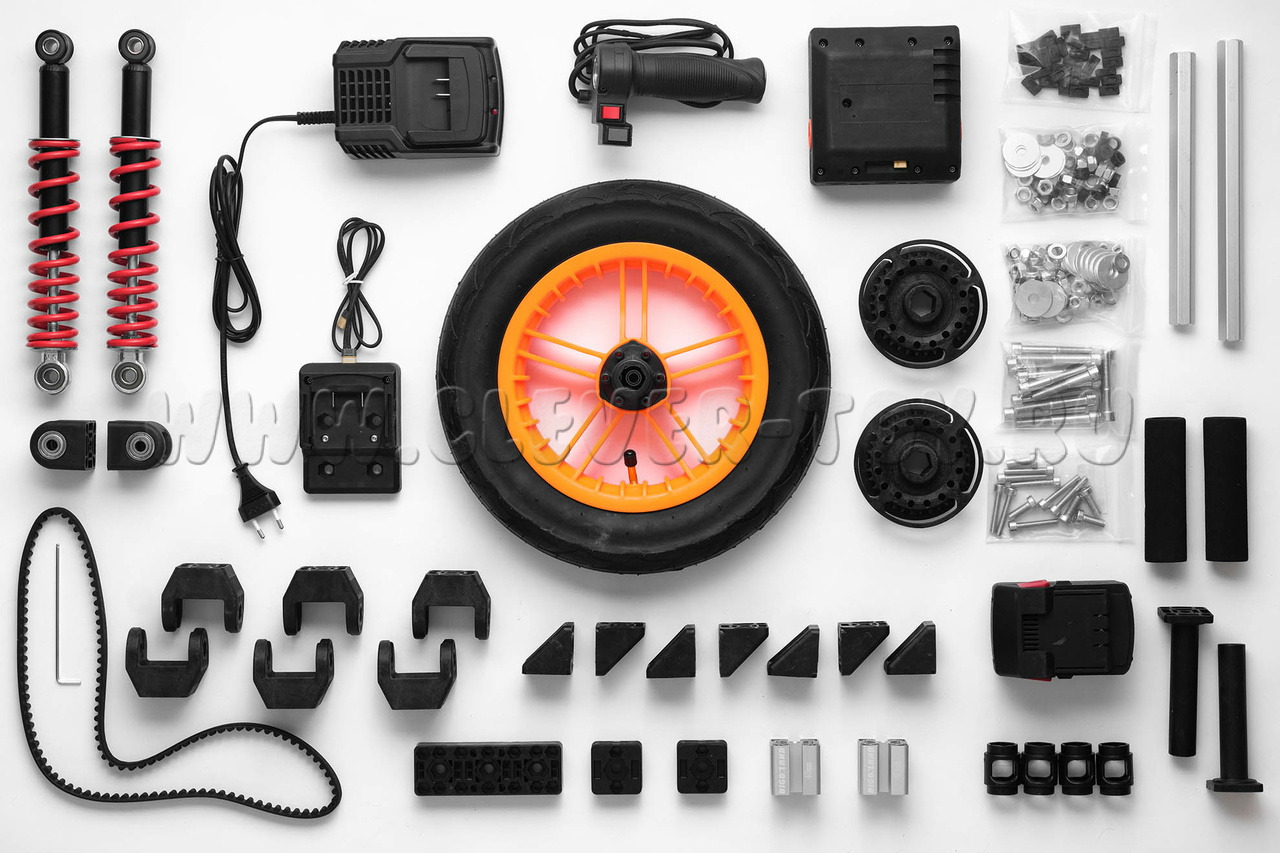 Из одного набора можно создать множество механизмов. Собрав одну модель (например, самокат) и прокатившись на нем, вы можете разобрать его и собрать что-то другое. Bigo подобен Лего, но больше по размеру и позволяет создавать не только статические модели, но и движущиеся объекты, которые можно катать или самому кататься на них. Позволяет собирать своими руками самокаты, твистеркаты, велосипеды, велотрайки, веломобили на педальном приводе и другие механизмы.