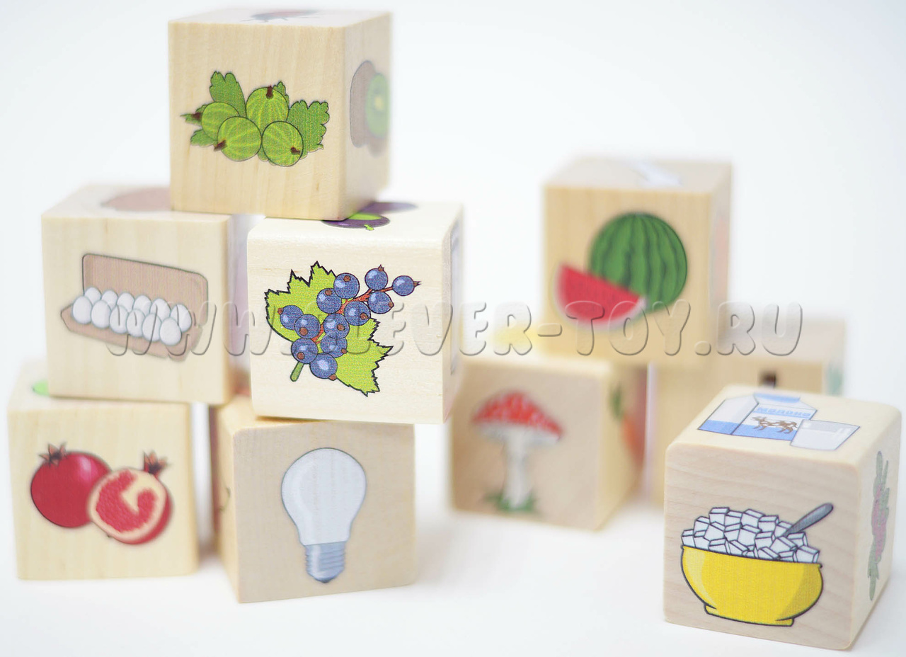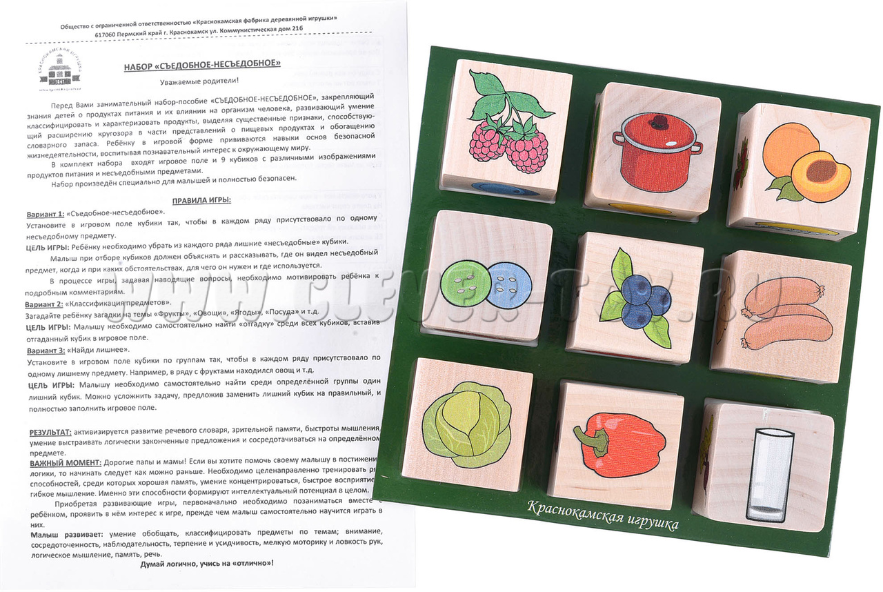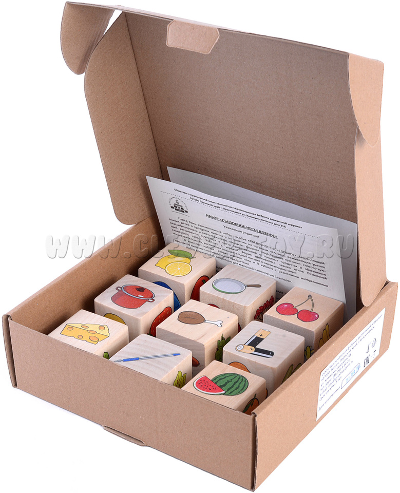 • 9 кубиков с изображениями продуктов питания и несъедобными предметами.