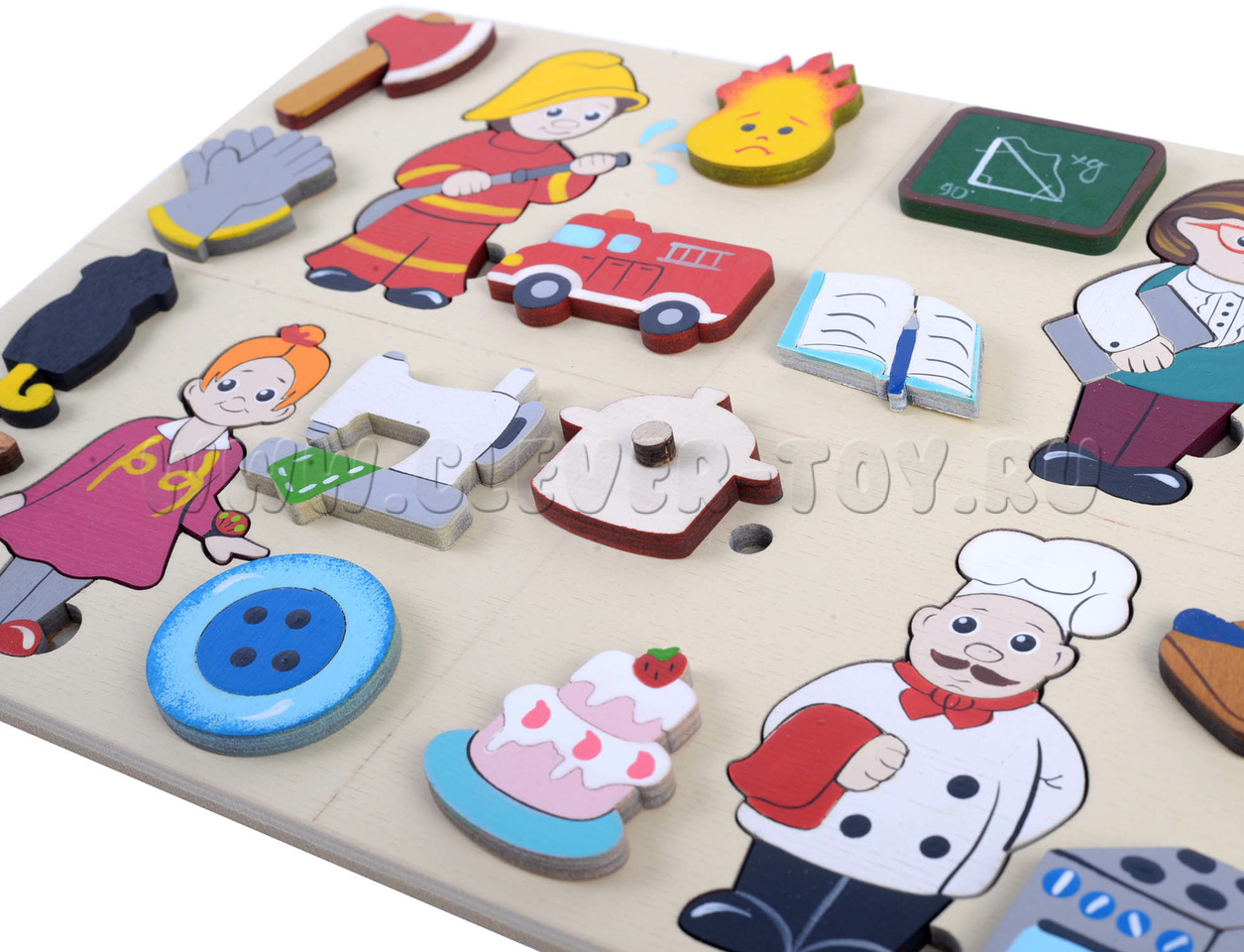 • Деревянное поле, рамка-вкладыш, разделено на 4 сектора, каждый сектор посвящен отдельной профессии;