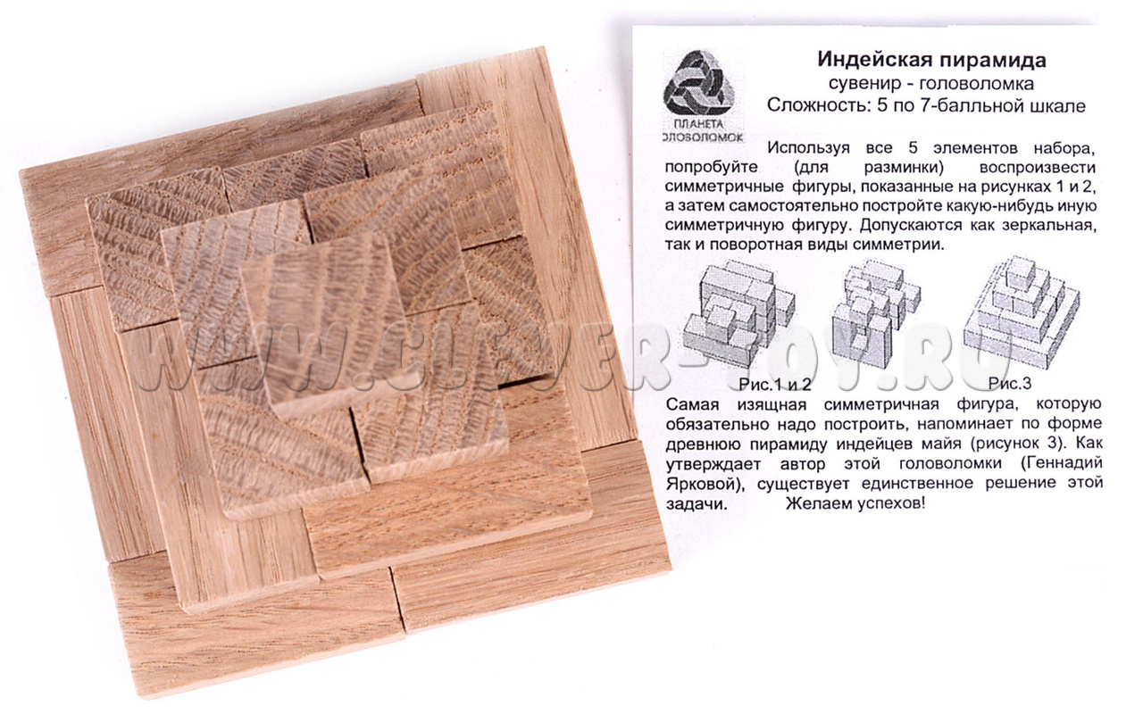 Важно, что ваши фигуры обязательно должны обладать зеркальной или поворотной симметрией. Кульминацией вашего строительства станет постройка Индейской пирамиды (пирамиды майя). Автор головоломки утверждает, что для решения головоломки с пирамидой есть только одно верное решение.