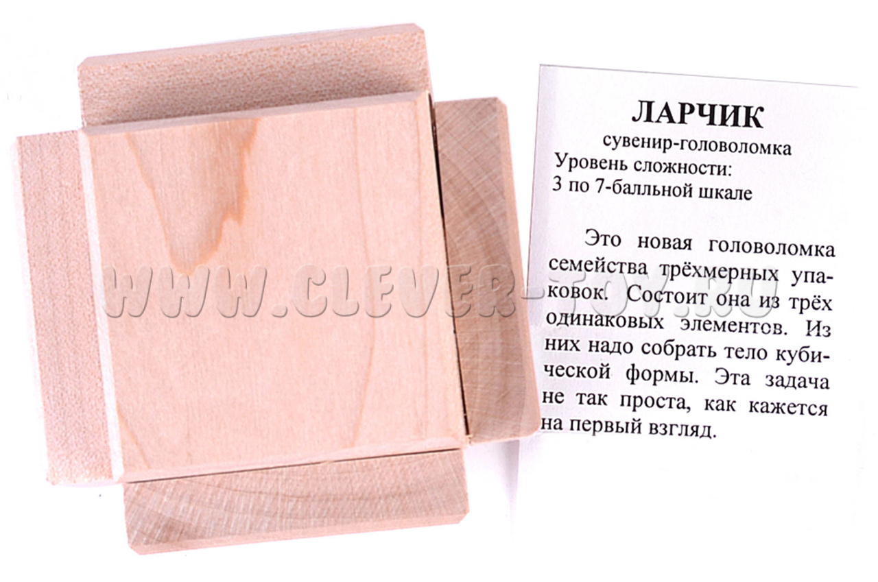 Головоломка "Ларчик" - это новая трехмерная головоломка, которая состоит из трех элементов. Цель игры - собрать эти элементы в коробку кубической формы.