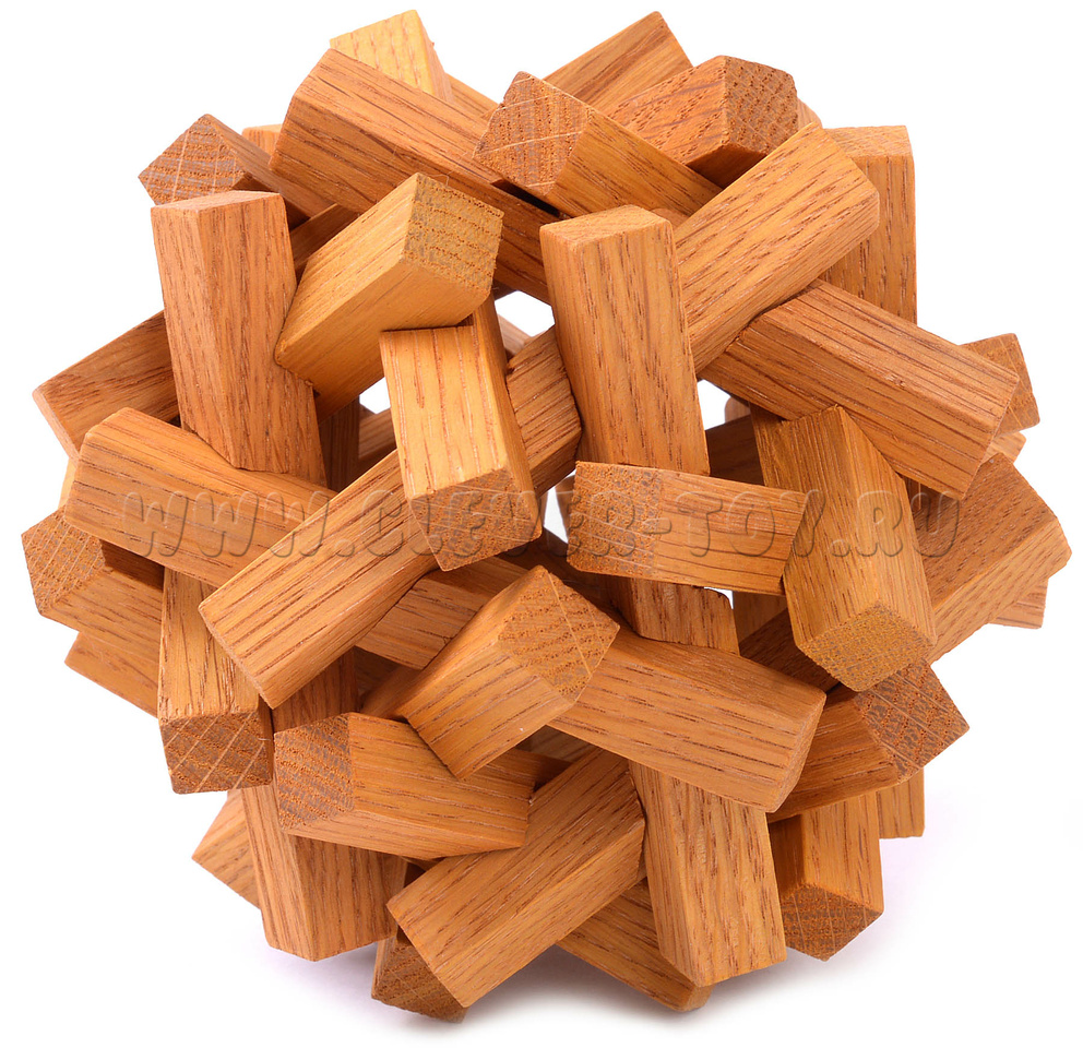 Этот деревянный узел состоит из 30 одинаковых брусочков, переплетенных между собой. Узел этот не сложно разобрать, но составить его снова будет не так просто.