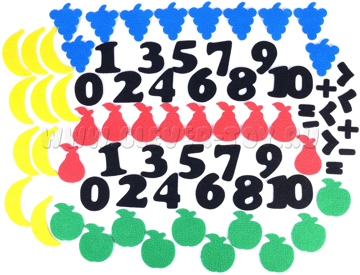 • игровые элементы в виде фруктов яблочек (10 шт.), винограда (10 шт.), груш (10 шт.), бананов (10 шт.)