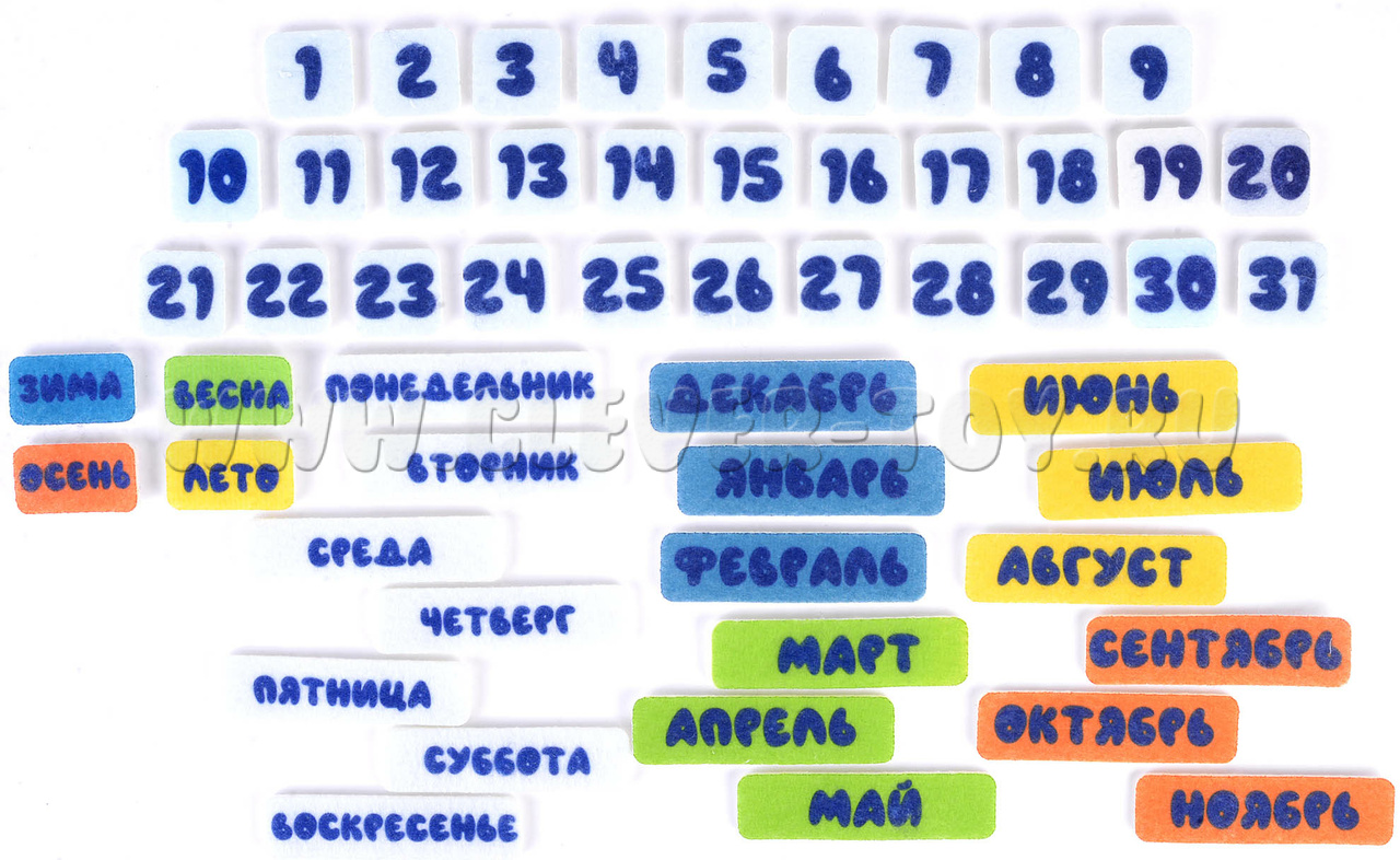 - игровые элементы: числа от 1 до 31, элементы с названиями дней недели, месяцев, времён года и т.д.