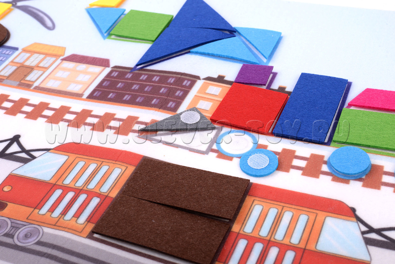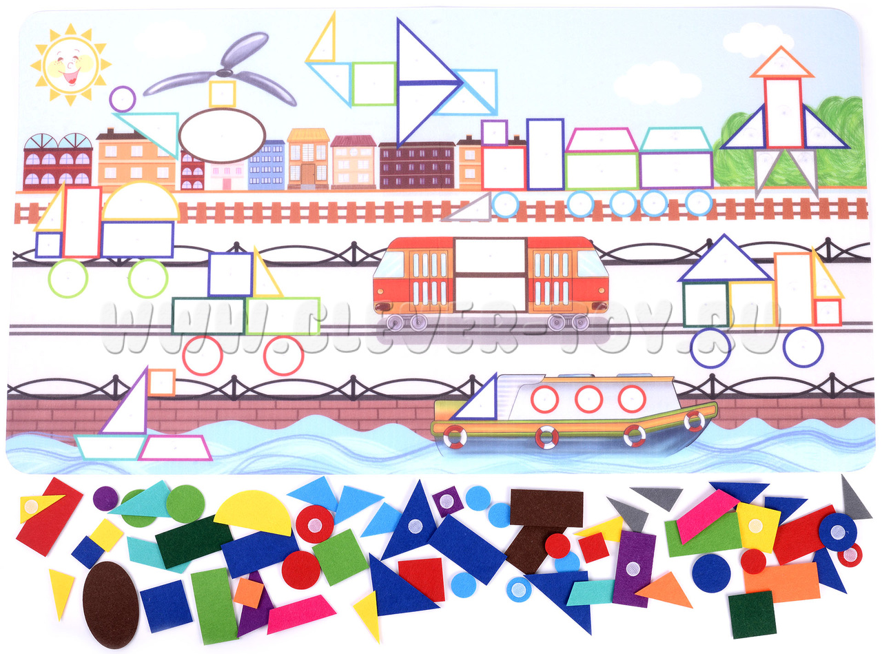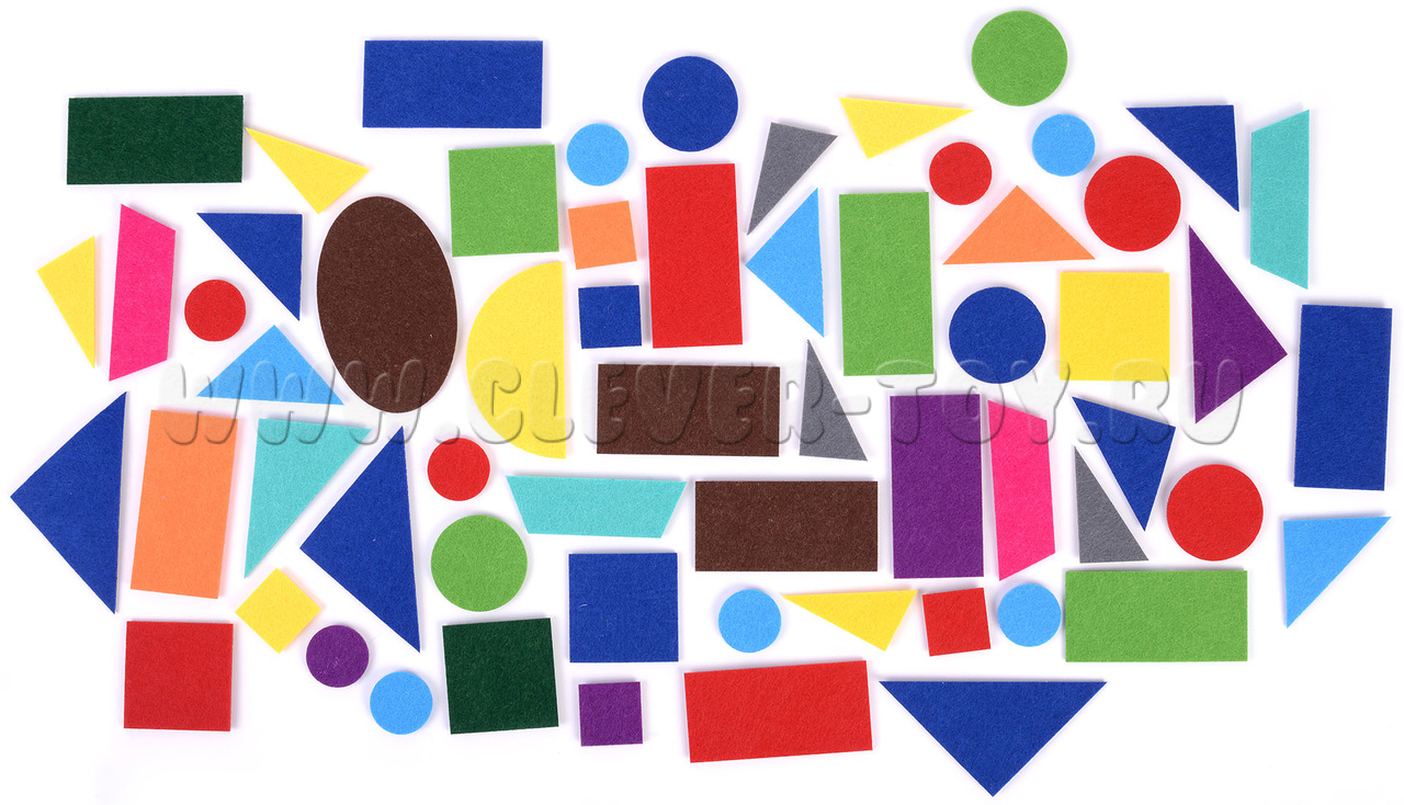 Состав набора: основа из фетра 1шт., геометрические фигуры на липучках 61 шт.