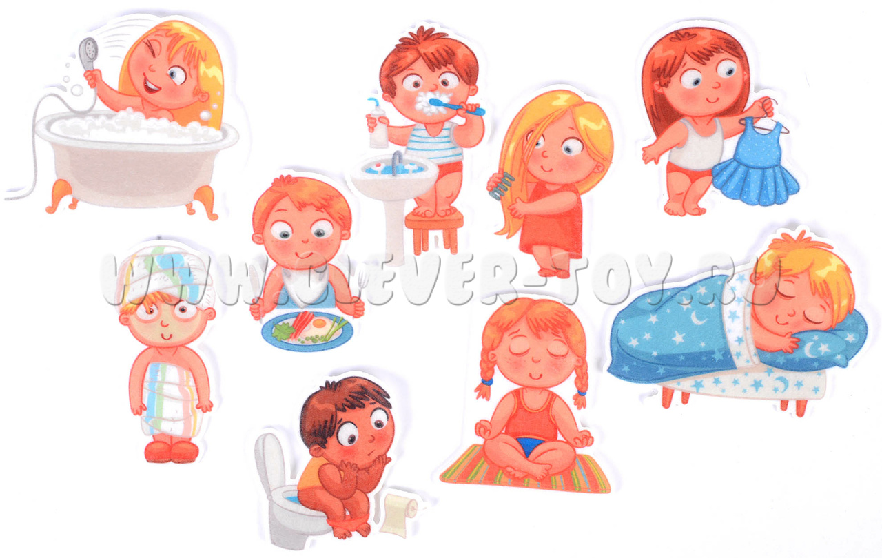 - 9 фигурок: ребёнок, сидящий на горшке, ребёнок, который чистит зубы, кушает, занимается йогой, расчёсывается, спит, одевается, ребёнка, принимающего ванную, ребёнка, закутанного в полотенце после купания;