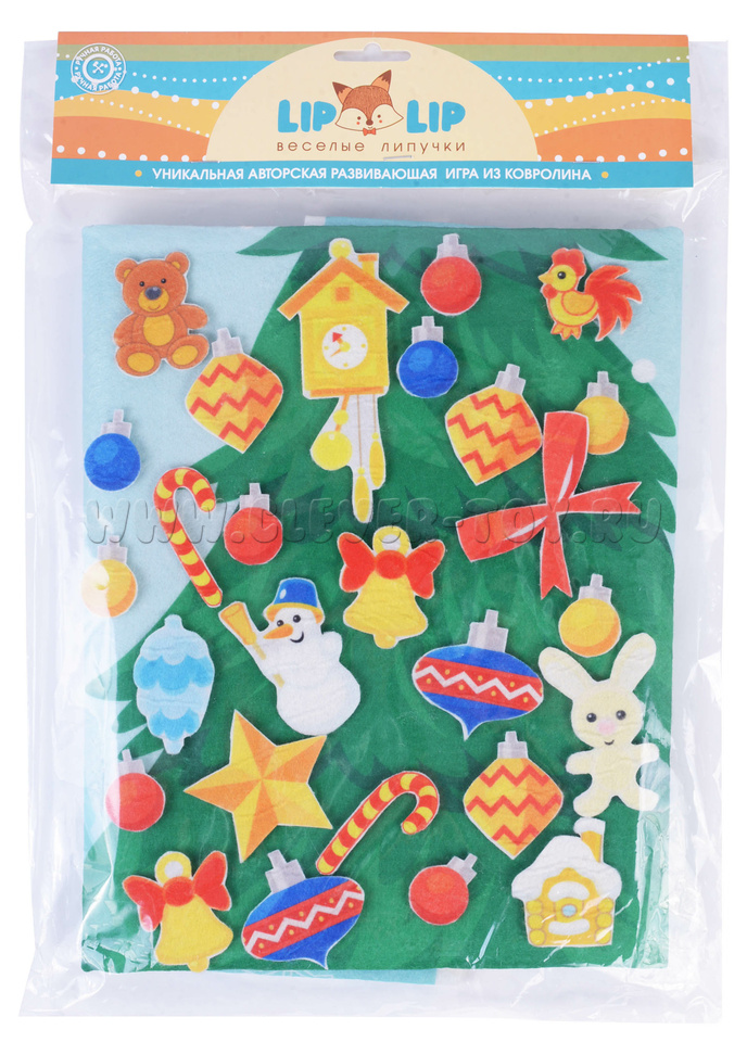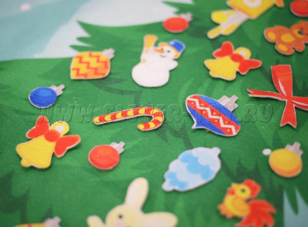 • игровые элементы из фетра – ёлочные игрушки (звёздочки, шишечки, зайчики, шарики, колокольчики, часики, бантики, леденцы).