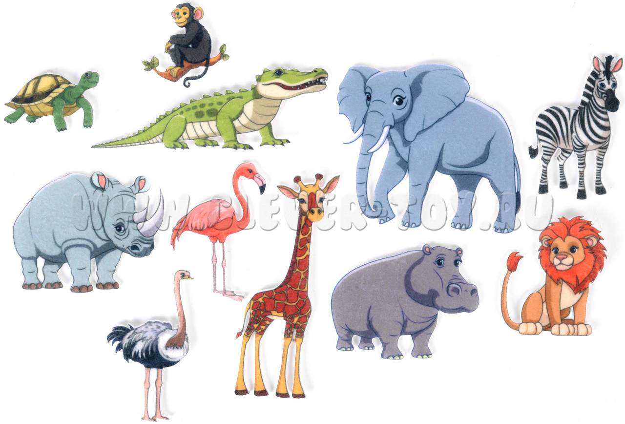- Фигурки: слон, лев, зебра, носорог, тигр, бегемот, жираф, фламинго, тукан, страус, черепаха, крокодил, змея и обезьяна (14 шт.).