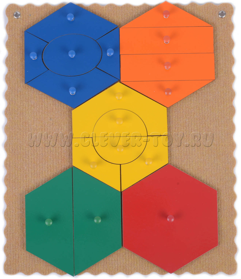 - Соты: целая – красного цвета, из 2-х частей – зелёного, из 4-х частей – оранжевого цвета; из 5-ти частей – жёлтого и синего цвета.