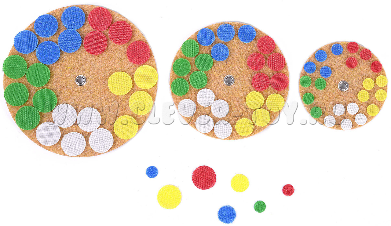 - разноцветные кружки 1 – кружки трёх размеров -10,15,20 мм., разных цветов - красный, жёлтый, зелёный, синий, белый с ковролиновой основой;