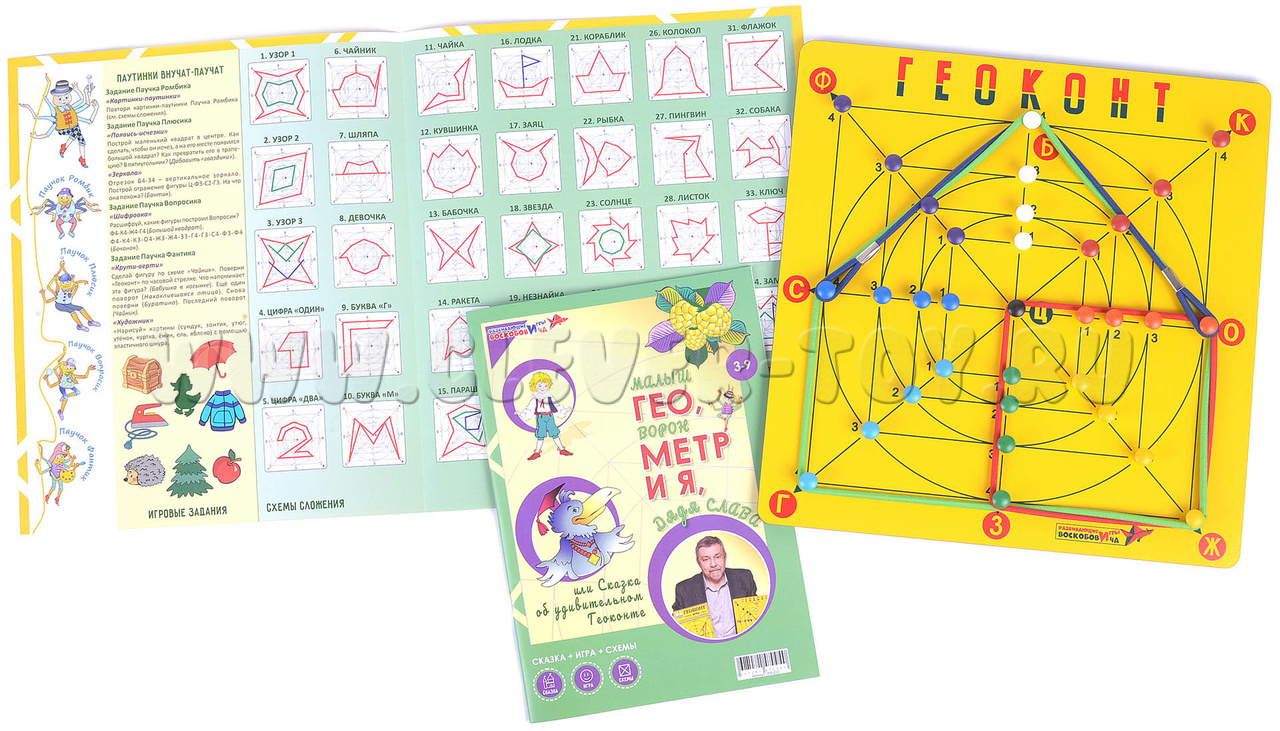 В набор также входит авторская методическая сказка «Малыш Гео, Ворон Метр и я, Дядя Слава, или Сказка об удивительномГеоконте». Сказка открывает цикл историй «Легенды Фиолетового леса». Дети слушают её занимательный сюжет, играют с разноцветными паутинками (резинками на гвоздиках) и параллельно осваивают строение геометрических фигур, углов, знакомятся с понятиями «отрезок», «луч», «прямая» и др. Представления, которые ребёнок получит, оказавшись в цент ре событий методической сказки, помогут ему успешно овладеть геометрией в школе.