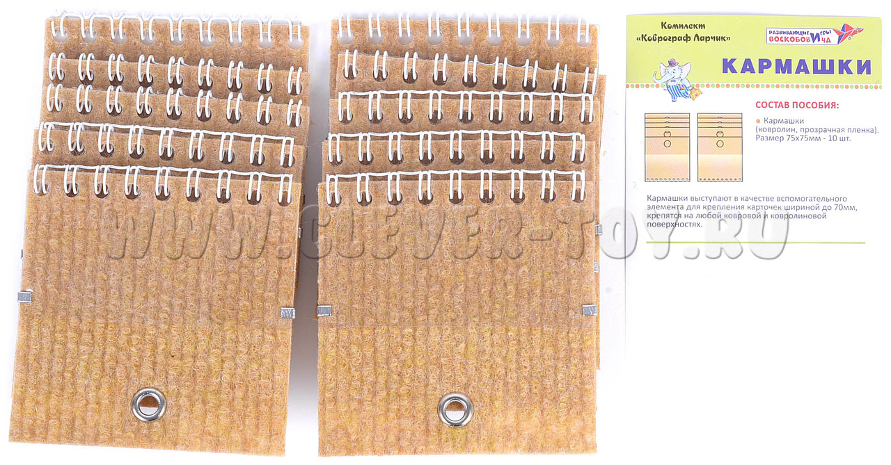 Кармашки выступают в качестве вспомогательного элемента для крепления карточек шириной до 70 мм, крепятся на любой ковровой и ковролиновой поверхности, в том числе на игровом поле набора «Коврограф Ларчик».