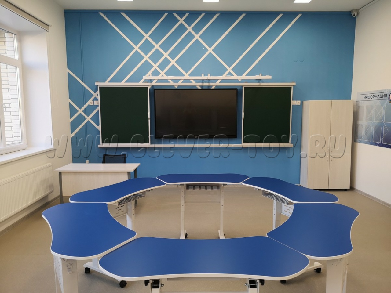 Рельсовая система — это цельная конструкция, состоящая из каркаса и четырёх рабочих поверхностей. Покрытие может быть магнитно-меловым, магнитно-маркерным или комбинированным.