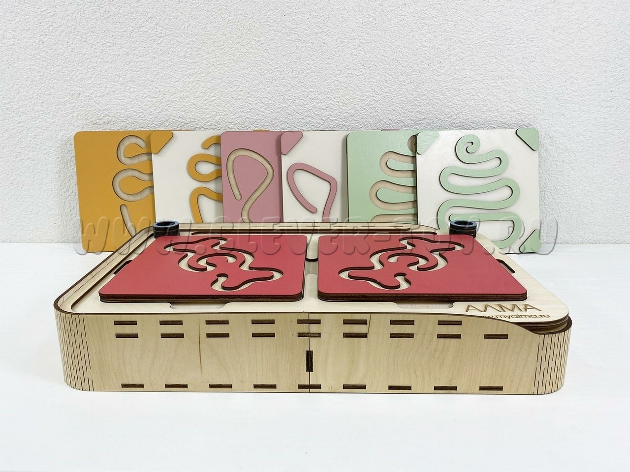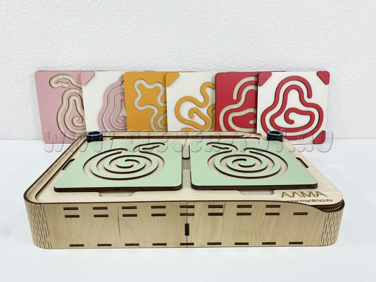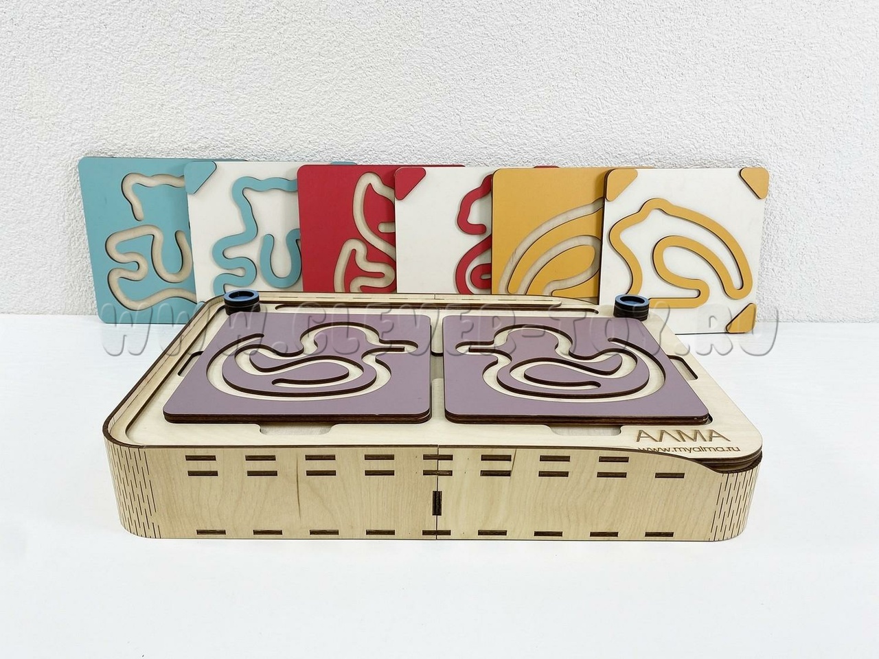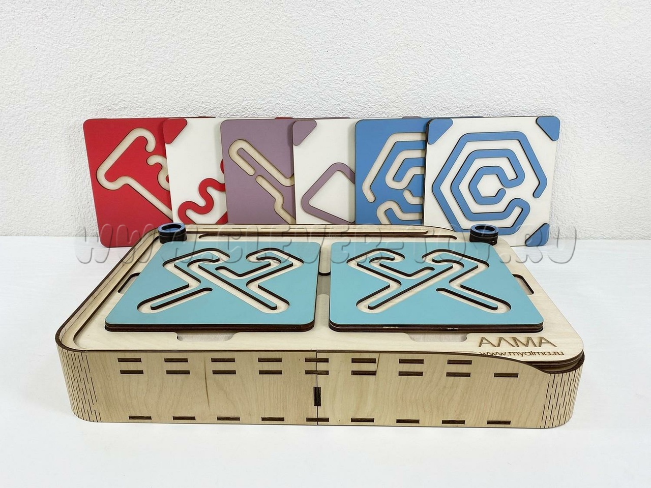 Два лабиринта с изображениями, расположенными симметрично, помещаются в пазы, и ребёнок проходит их с помощью специальных пальчиковых фишек. Такие занятия способствуют развитию мелкой моторики, внимательности и логического мышления.
