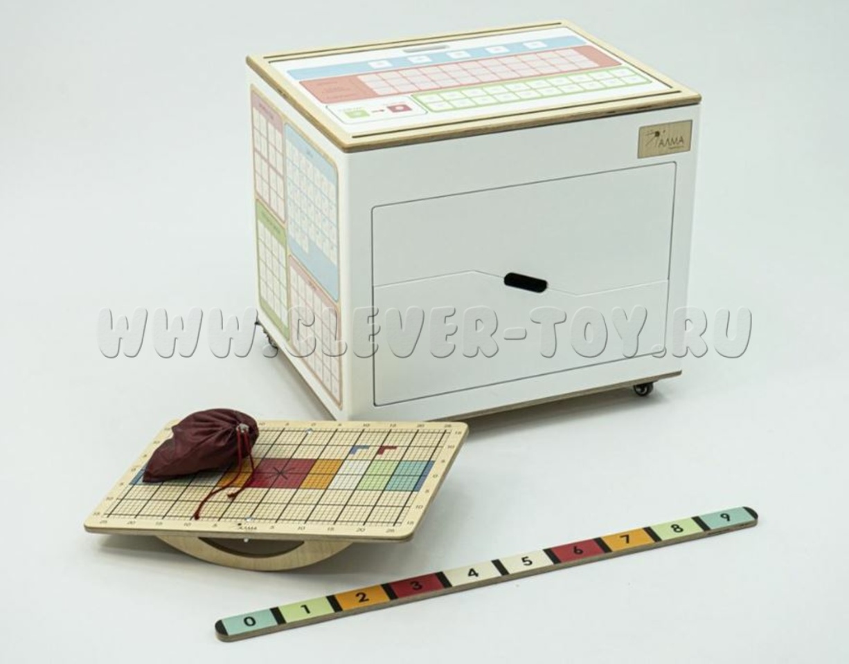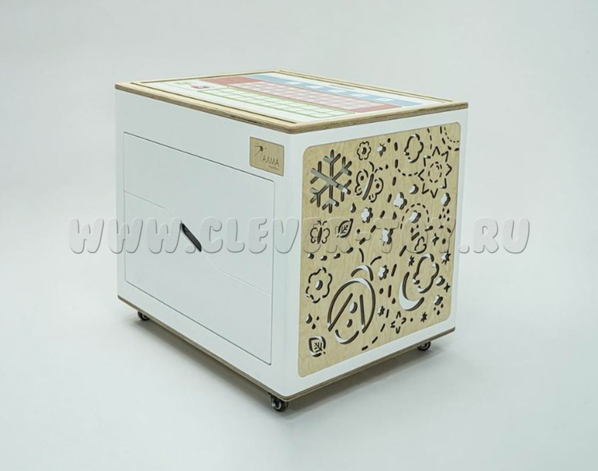 Мобильный куб с выкатными ящиками плавного хода, функциональными боковинами и верхней крышкой. Его можно передвигать в любое место, где ребёнку будет удобно заниматься.