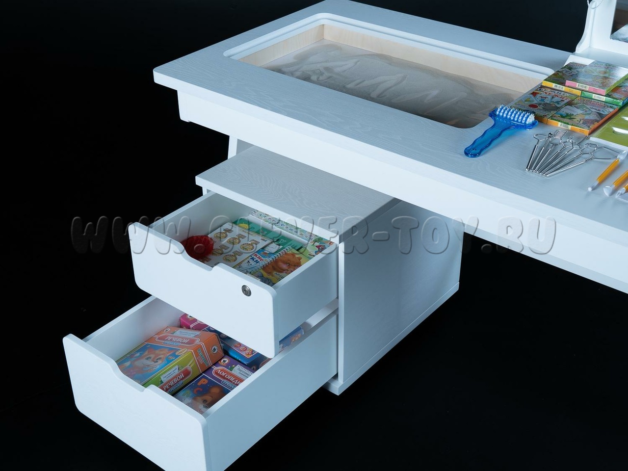 - Световой песочный стол. Отсек для песочной терапии с практичной крышкой поможет проводить занятия для развития мелкой моторики, сенсорных навыков и гармонизации психоэмоционального состояния ребёнка.