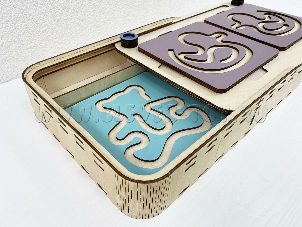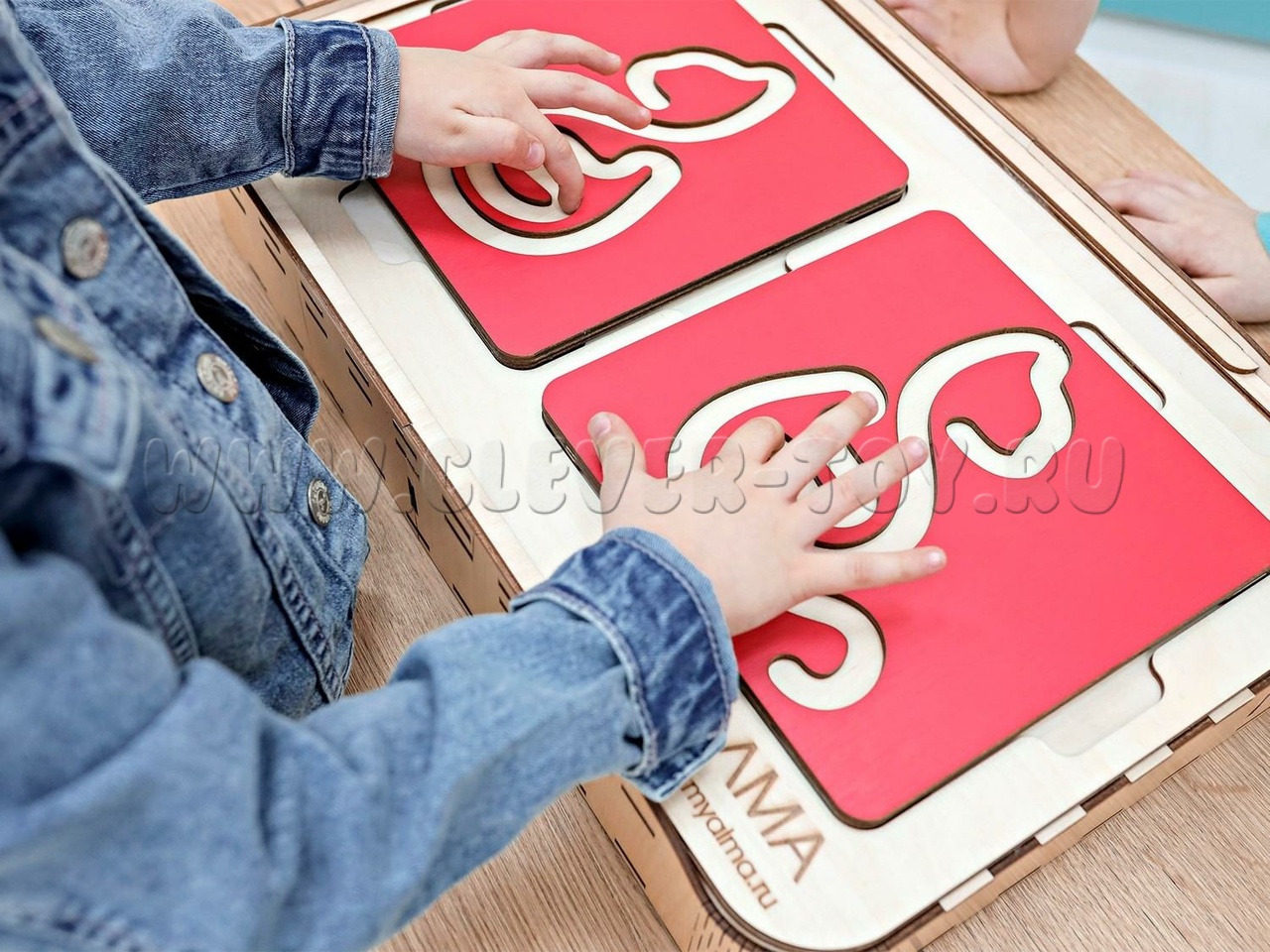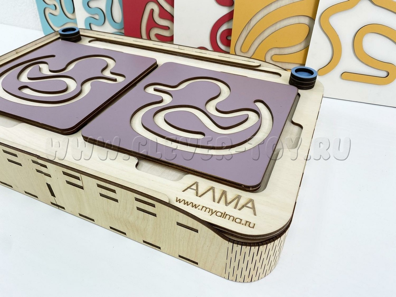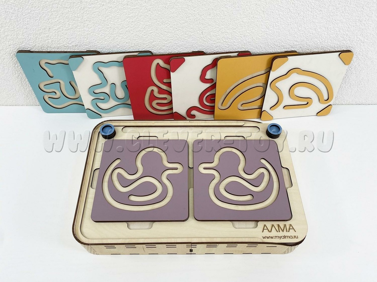 Два лабиринта с изображениями, расположенными симметрично, вставляются в пазы, и ребёнок проходит их с помощью специальных пальчиковых фишек.