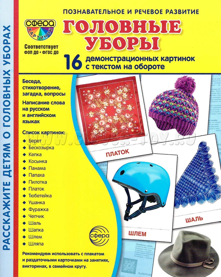 Набор карточек "Головные уборы"- это 16 демонстрационных картинок для познавательного и речевого развития. На обороте каждой предметной картинки - описание, вопросы для ребёнка, название на русском и английском языках.