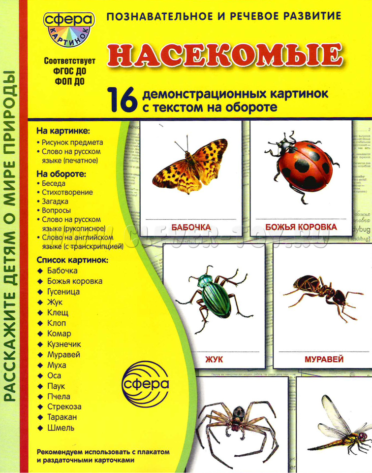 На лицевой стороне каждой картинки дается цветное изображение насекомого - краткое описание, стихотворение, загадка и вопросы по теме. Название каждого насекомого имеет перевод на английский язык и соответствующую транскрипцию. Материал излагается доступным для ребенка языком и целиком раскрывает тему.