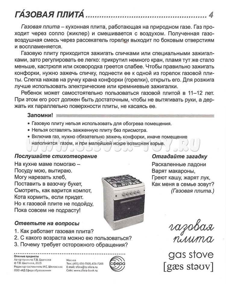 На каждой карточке есть изображение прибора или предмета, а на обратной стороне - подробное описание. Из него дети узнают, как выглядит прибор, из каких частей состоит, для чего нужен и как с ним правильно обращаться. Также в блоке "Запомни!" приведены тезисные рекомендации по правилам безопасности.
