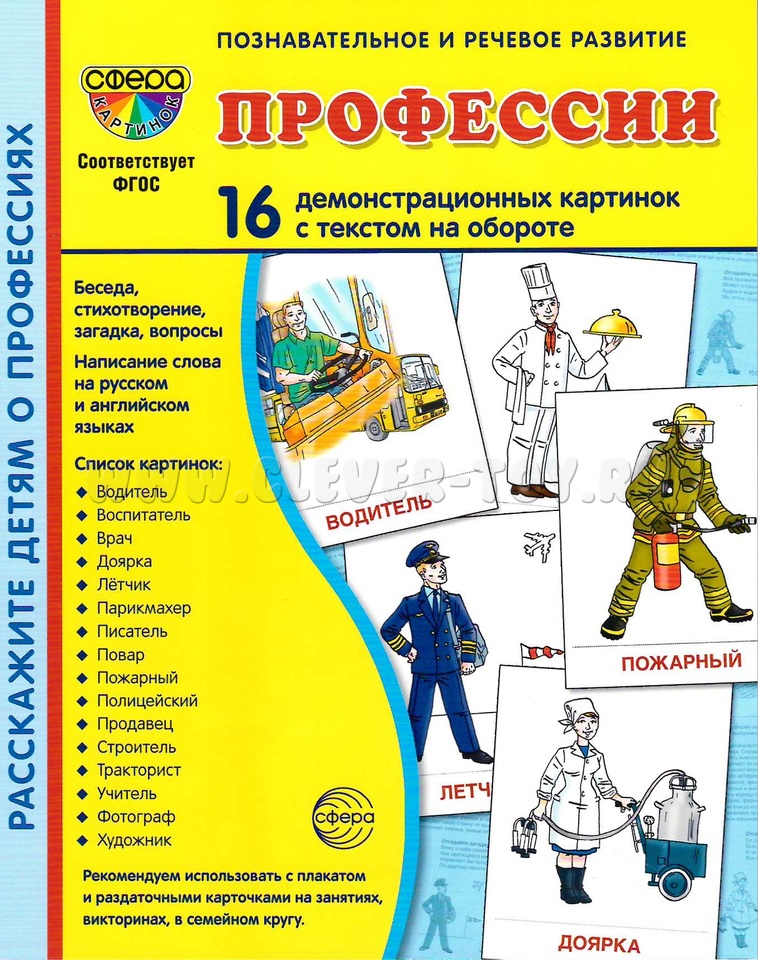 Набор карточек "Профессии" состоит из бесед, стихотворений, загадок и вопросов по теме. Комплект включает 16 цветных демонстрационных картинок с текстом на обороте, названия тем имеют перевод на английский язык.