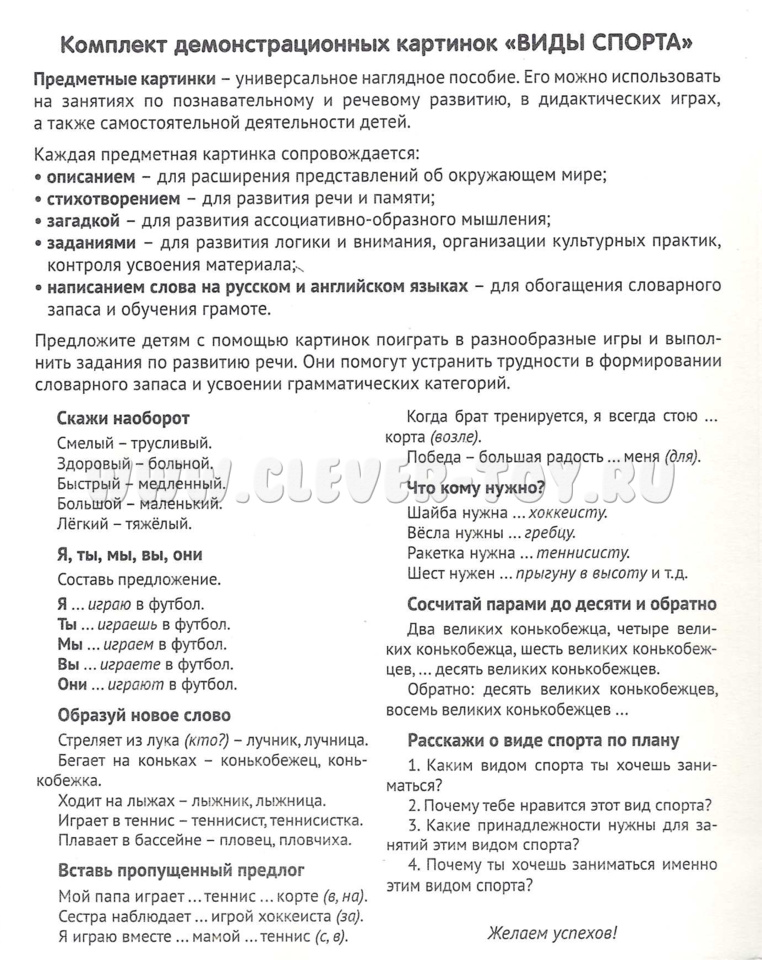 Каждая предметная картинка сопровождается: описанием - для расширения представлений об окружающем мире; стихотворением - для развития речи и памяти; загадкой - для развития ассоциативно-образного мышления; заданиями - для развития логики и внимания, организации культурных практик, контроля усвоения материала.