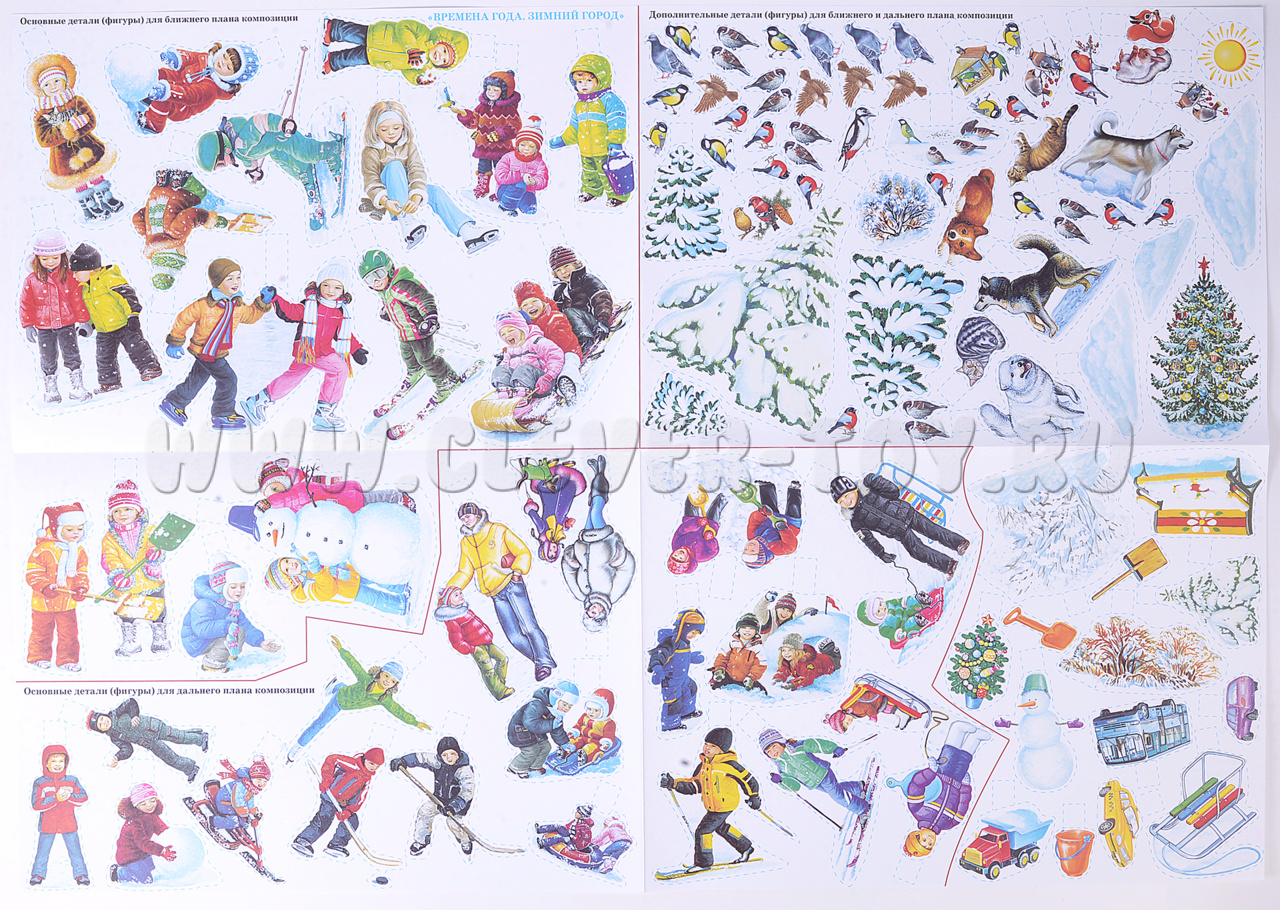 - плакат (А1) с изображением основных и дополнительных фигурок (100-150 штук) для вырезания и наклеивания на сюжетную картину;