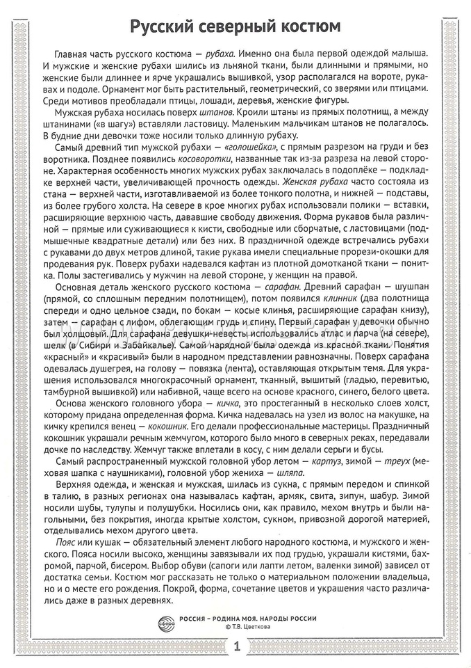 Каждый народ отличался своим уникальным стилем одежды, который варьировался в зависимости от региона. В нашем пособии представлены обобщённые варианты этих костюмов, отражающие их характерные особенности. Информация подана в сжатой форме, но при этом содержит все необходимые сведения для детей в возрасте от 6 до 11 лет.