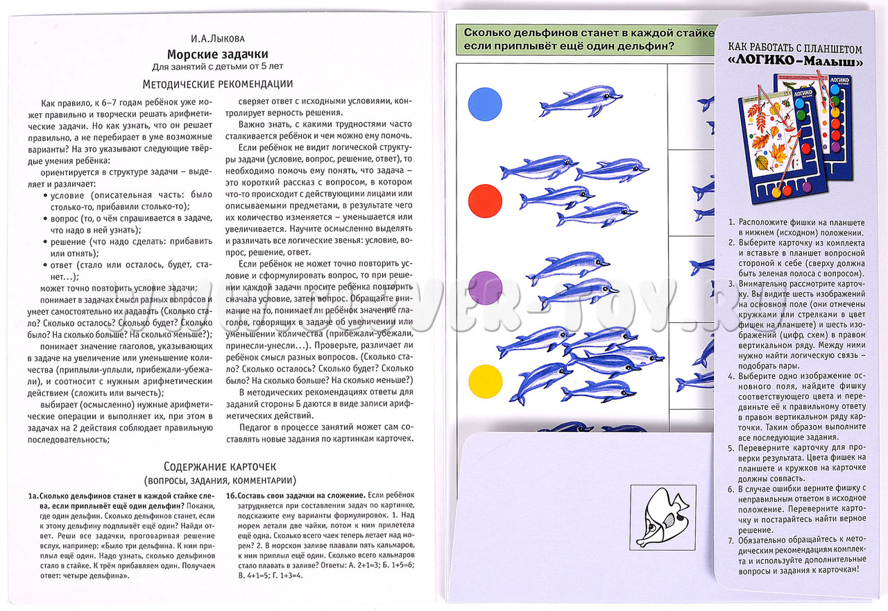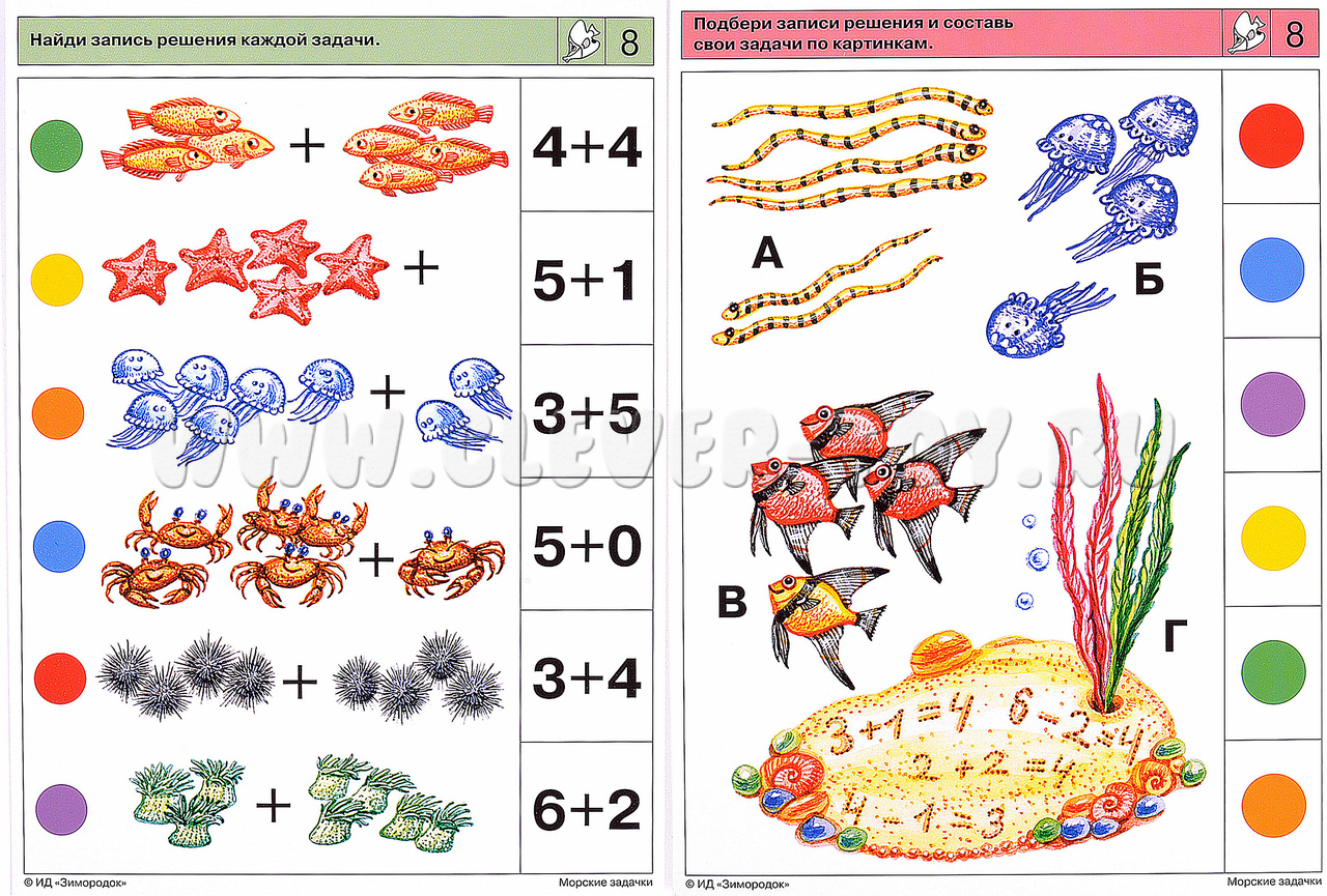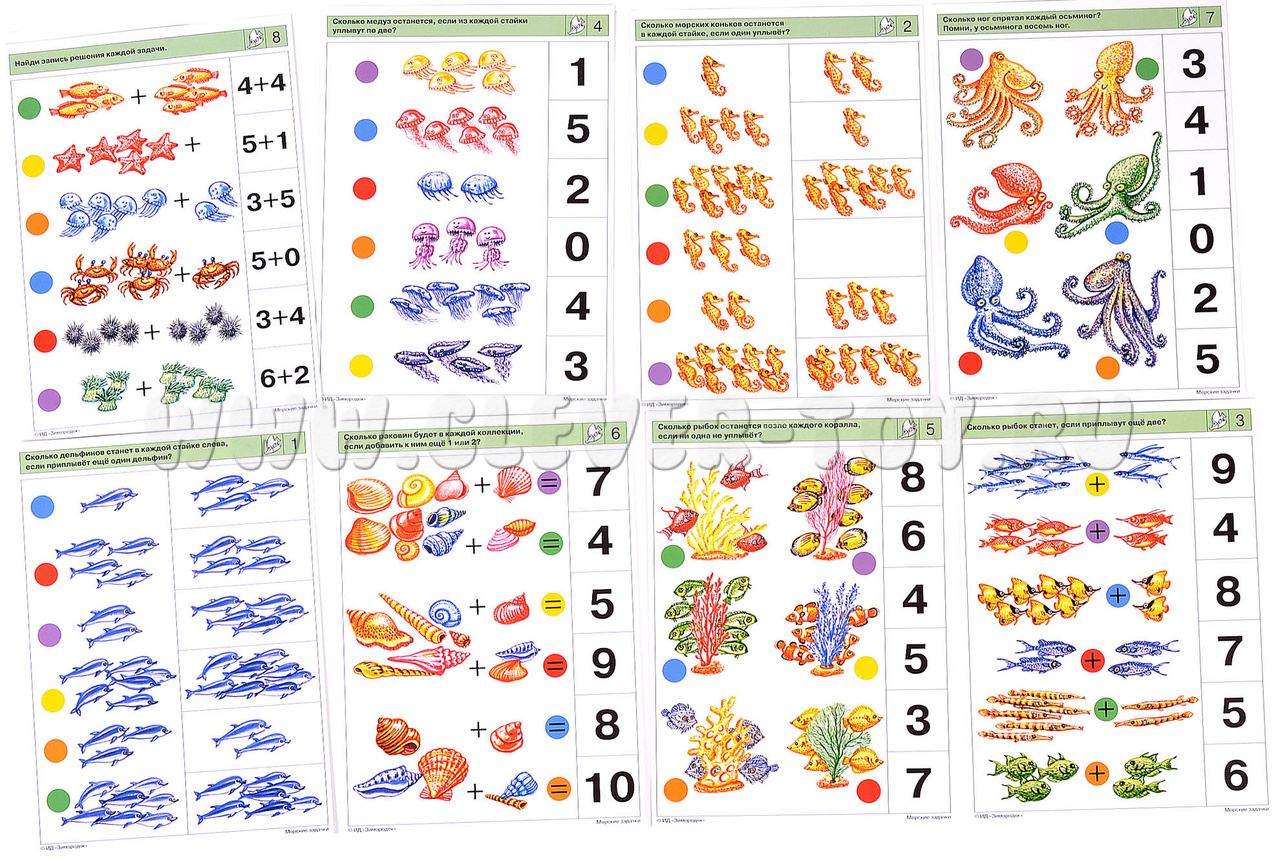 Как правило, к 6–7 годам ребёнок уже может правильно и творчески решать простейшие арифметические задачи. Задания комплекта объясняют логическую структуру задачи (условие, вопрос, решение, ответ), благодаря чему ребёнок осмысленно различает все вышеупомянутые логические звенья задачи, выбирает нужные арифметические операции (при этом в задачах на 2 действия соблюдает правильную последовательность), понимает значение глаголов, указывающих в задаче на увеличение или уменьшение количества (приплыли-уплыли), различает смысл вопросов (Сколько будет? Сколько было? Сколько осталось? На сколько меньше?). Примеры заданий в карточках: 1а. Сколько дельфинов станет в каждой стайке, если приплывёт ещё один дельфин? 3а. Сколько рыбок станет, если приплывут ещё две? 4а. Сколько медуз останется, если из каждой стайки уплывут по две? 6а. Сколько раковин будет в каждой коллекции, если добавить к ним ещё 1 или 2. 7а. Сколько ног спрятал каждый осьминог?