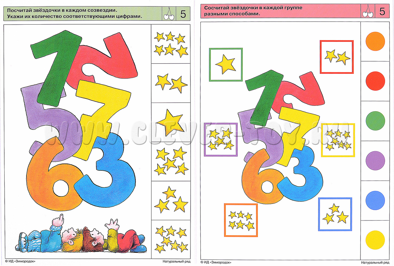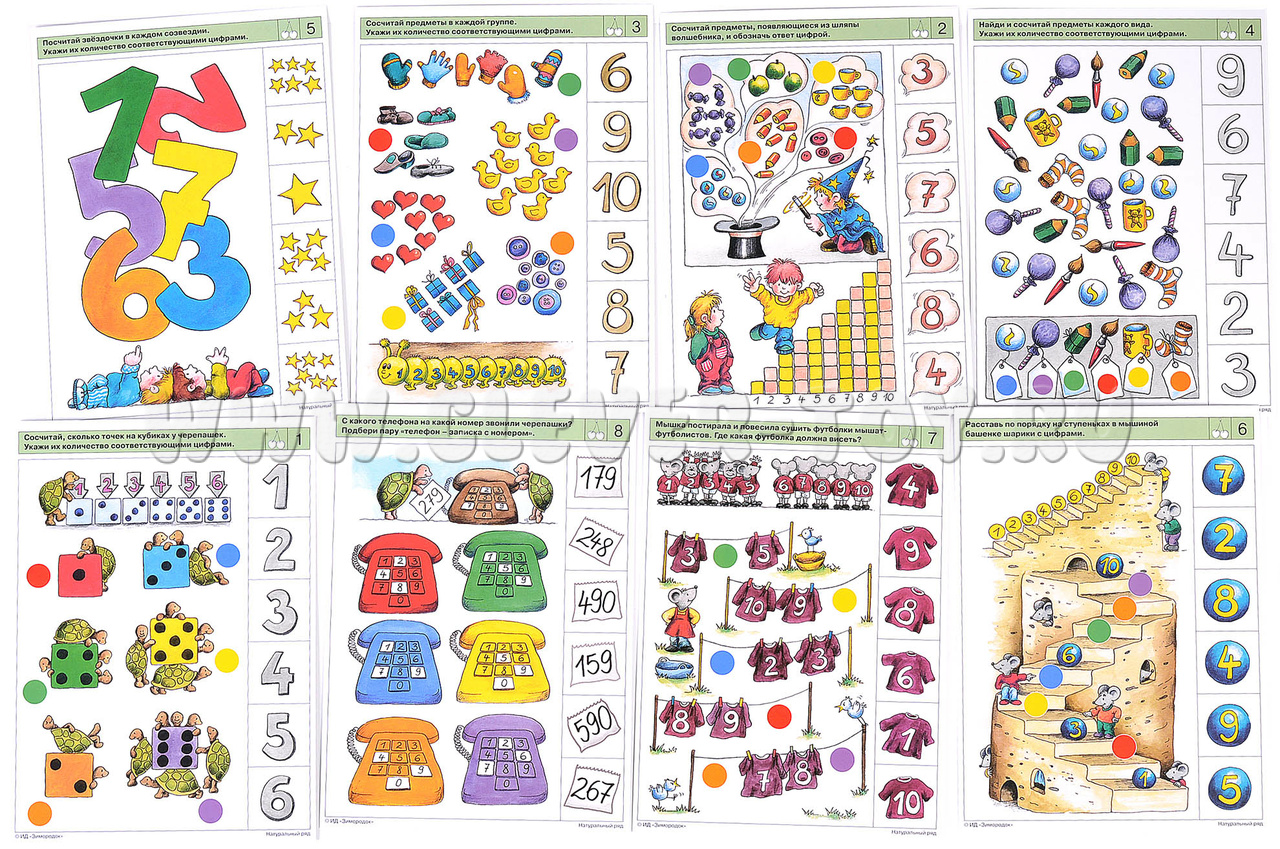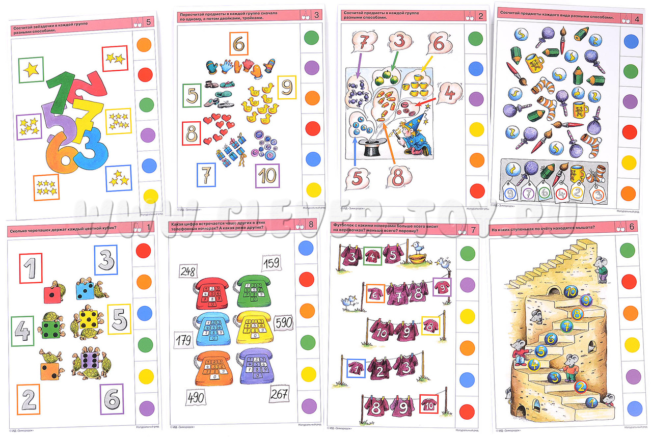 Настоящий комплект карточек содержит задания, позволяющие ребёнку находить и запоминать способы решения учебных задач, стимулирует переход к визуальному счёту (счёту «глазами», без указания пальчиком объектов при пересчёте). Ребёнок научится самостоятельно выбирать, применять и объяснять определённые технические приёмы, делать выводы о результатах собственной деятельности. В процессе работы с карточками ребёнок узнает, как получаются однозначные и двузначные числа; сможет запомнить правила построения числового ряда; научится восстанавливать последовательность чисел натурального ряда, а также вести прямой и обратный счёт в пределах десяти. Примеры заданий в карточках: 2а. Сосчитай предметы, появляющиеся из шляпы волшебника, и обозначь ответ цифрой. 2б. Сосчитай предметы в каждой группе разными способами. 5а. Посчитай звёздочки в каждом созвездии. Укажи их количество цифрами. 6а. Расставь по порядку на ступеньках в мышиной башенке шарики с цифрами. 8а. С какого телефона и на какой номер звонили черепашки?