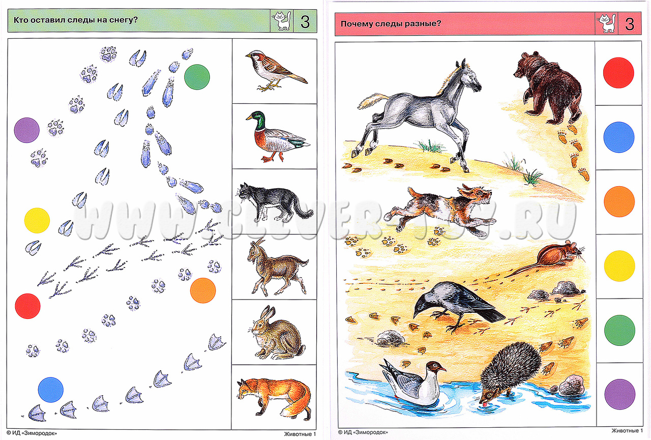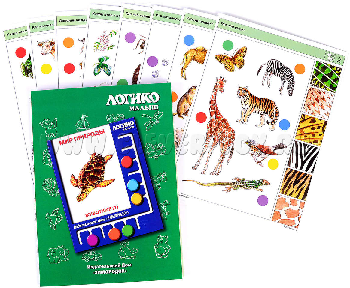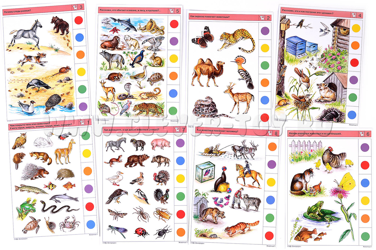 Основное назначение комплекта – ознакомление ребёнка с разнообразным миром животных. В процессе решения заданий, ребенок будет не только узнавать и называть новых и хорошо ему известных представителей животного мира, но и подбирать для них жилища, «одежду», питание, среду обитания, следы. Кроме того он будет определять к какой группе относятся те или иные представители животных (млекопитающие или звери, птицы, насекомые, рыбы, пресмыкающиеся и др.), опираясь в своем выборе на общие признаки отдельных видов. Другие темы карточек: пары взрослых животных и их детенышей; этапы развития; способы передвижения; взаимодействие с человеком. Задания по теме равномерно распределены на два комплекта карточек Животные (1) и Животные (2) и не повторяются. Примеры заданий в карточках: 1б. Чем покрыто тело этих животных? У кого перья, шерсть, иголки, чешуя, кожа, панцирь? 3а. Кто оставил следы на снегу? 4а. Где чьё жилище? 6а. Какой этап в развитии животных пропущен? 7б. Где домашние, а где дикие животные (птицы)?