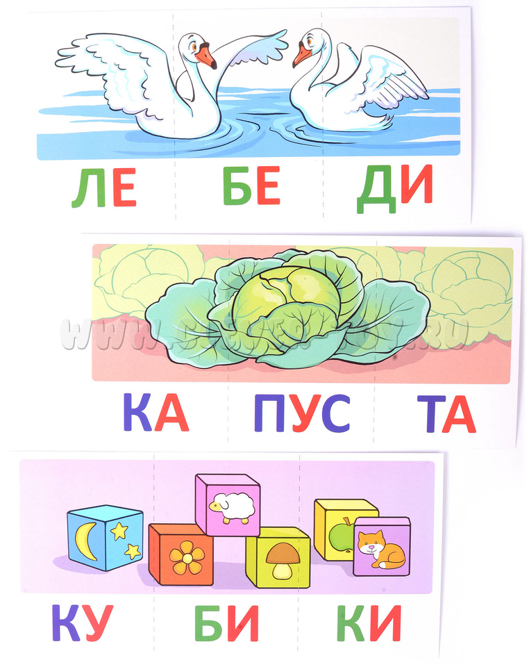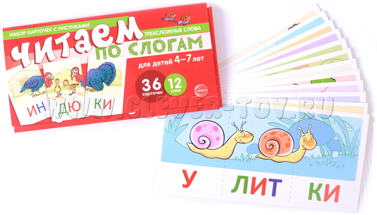 Набор карточек с рисунками. Читаем по слогам. Трехсложные слова. Для детей 4-7 лет