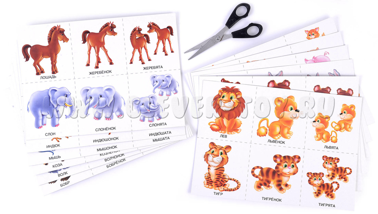 Перед началом игры нужно разрезать карты по пунктирным линиям (получится 72 карточки). Детям раздаются карточки со взрослыми животными, затем ведущий показывает изображения детенышей, а ребята подбирают соответствующие карточки.
