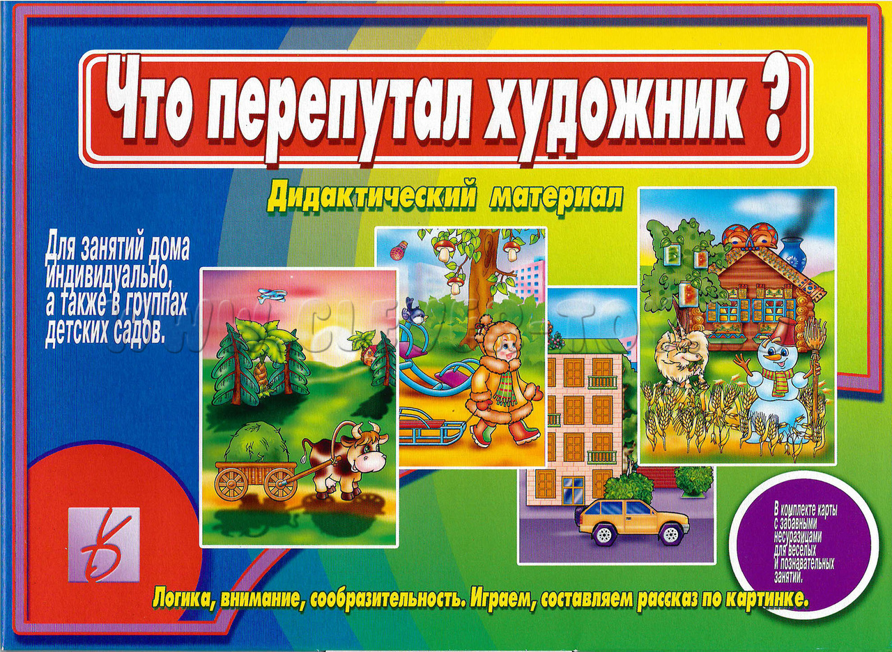 Игра состоит из 16 сюжетных картинок (по 2 изображения на листе А4). Ребенку предлагается найти и исправить допущенные художником ошибки, аргументировать свой ответ, придумать к картинке небольшой фантастический рассказ, дав волю воображению.