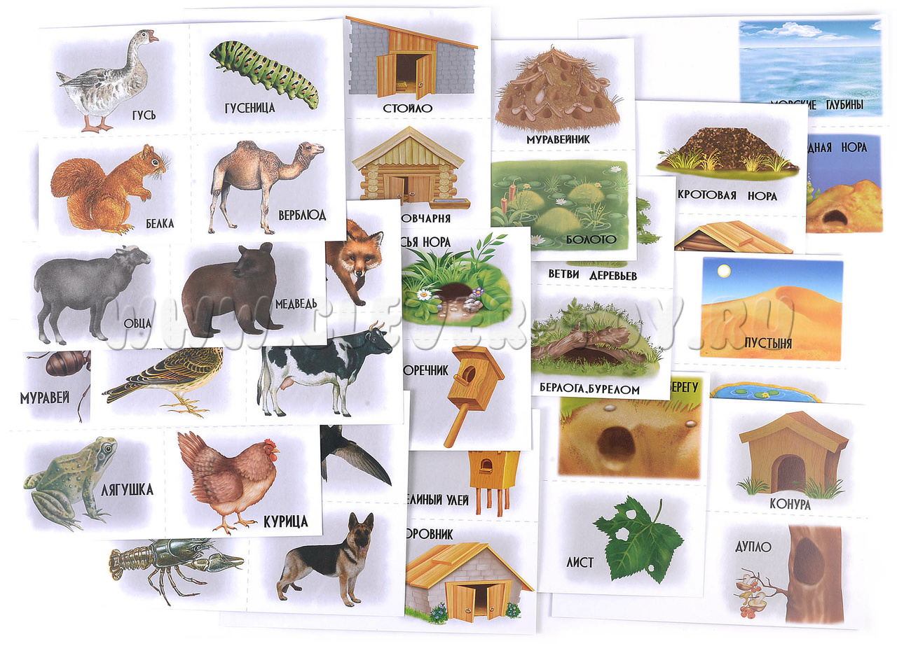Ребенок раскладывает карточки с животными на изображения жилищ, в которых они обитают. Расскажите ему, где медведь проводит зиму, где курица высиживает яйца и т.п. Поведайте все, что Вы знаете о каждом животном, а потом предложите ребенку самому рассказать о жизни и повадках героев игры.