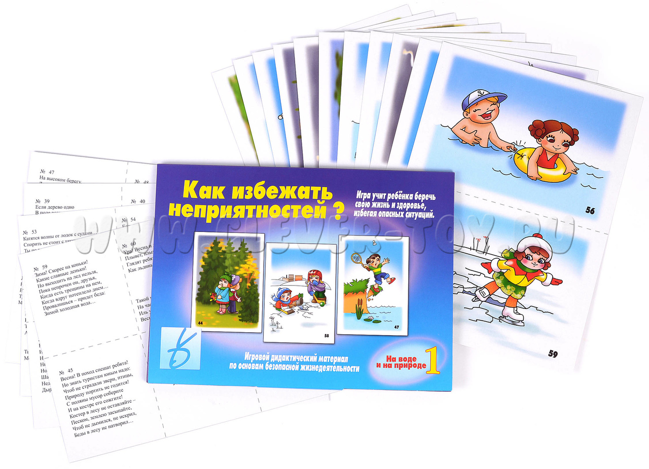 Игровой дидактический материал "Как избежать неприятностей? На воде и на природе" предназначен для детей в возрасте от 5 до 9 лет и нацелен на обучение основам безопасности жизнедеятельности. Материал содержит яркие картинки-иллюстрации ситуаций, которые могут возникнуть во время активных игр на воде и на природе, а также стихи для легкого запоминания правил.
