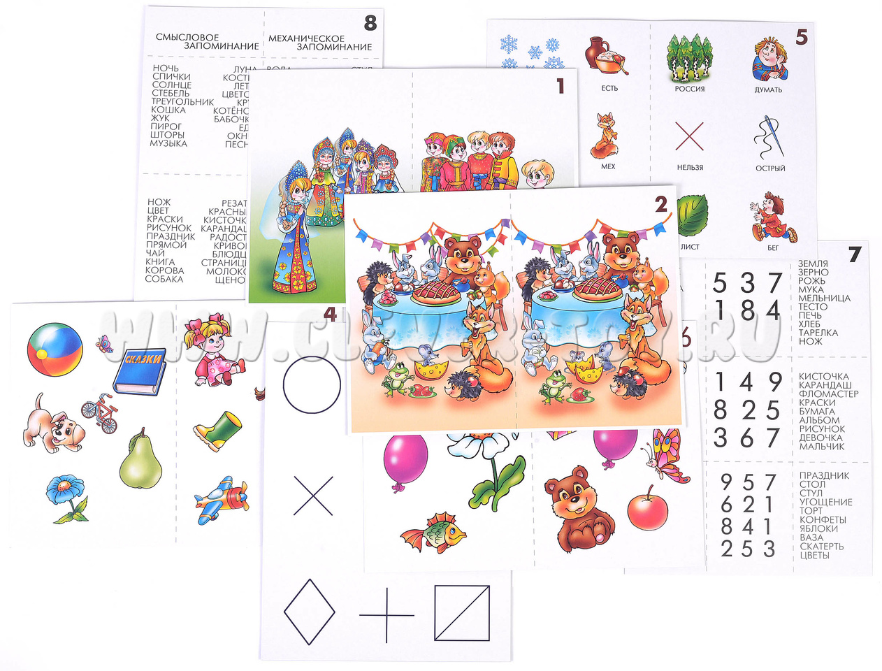 В комплекте удобная папка для хранения и 8 карт с заданиями, каждое на отдельном листе. Все задания направлены на запоминание и воспроизведение полученной информации (зрительные и отвлеченные образы, связь между запоминаемым словом и опорной картинкой и т.д.). Рекомендуются ежедневные занятия длительностью не более 15-20 минут.