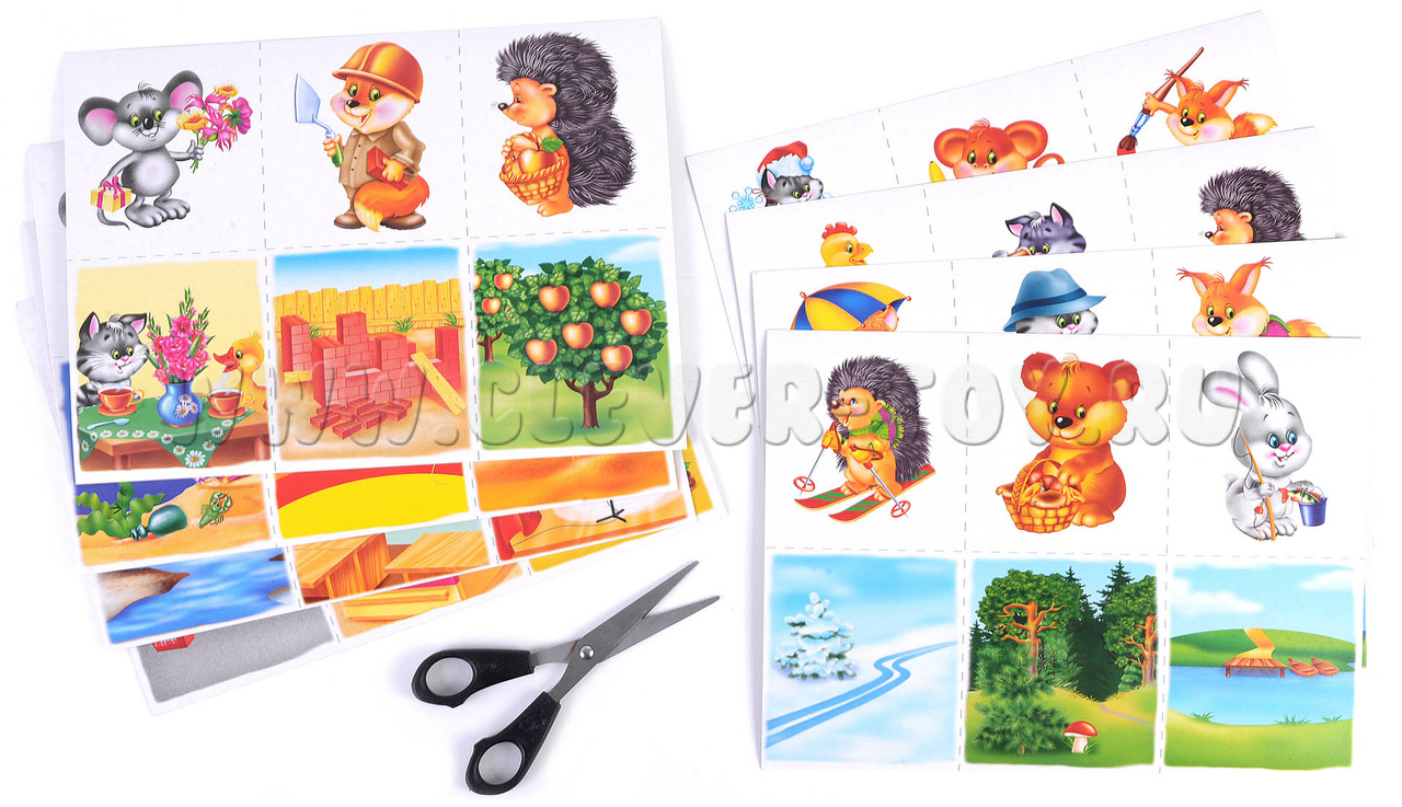 Если играет несколько детей, раздайте им поровну карточки с животными. Показывайте поочерёдно карточки с сюжетами. Тот ребёнок, которому нужна картинка с этим сюжетом, забирает её себе.