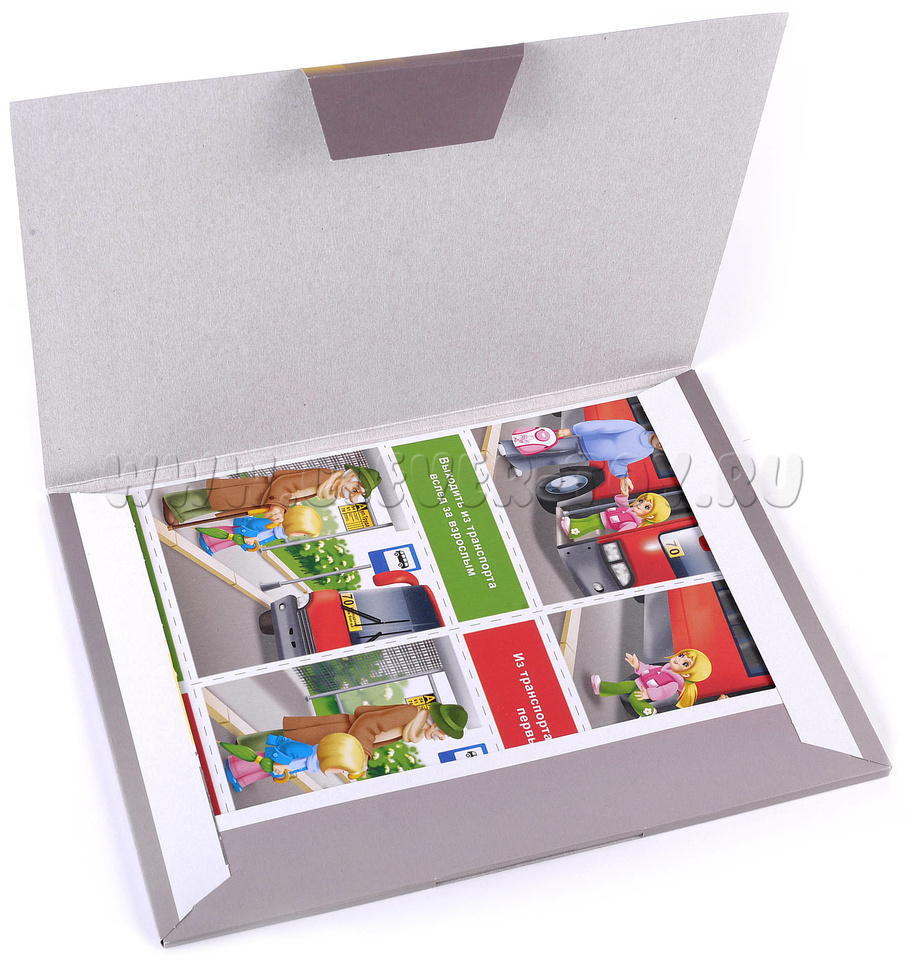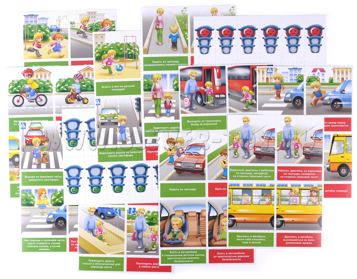 Перед началом игры необходимо разрезать карты по пунктирным линиям. В результате получится 40 карточек с сюжетными картинками (20 пар карточек), 40 карточек с надписями и 24 карточки со светофорами.