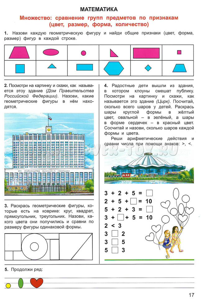 - Математика (Множество: сравнение групп предметов по признакам (цвет размер, форма, количество)).