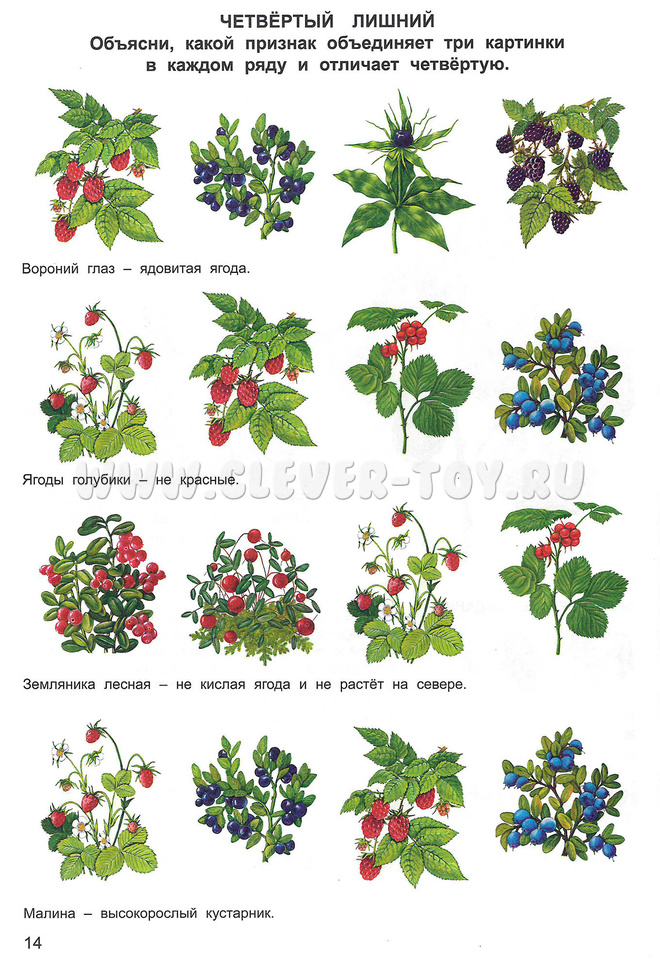- Познавательная информация о 10 видах лесных ягод (клюква, земляника, брусника, ежевика, малина, голубика, волчье лыко, черника, вороний глаз, костянка);