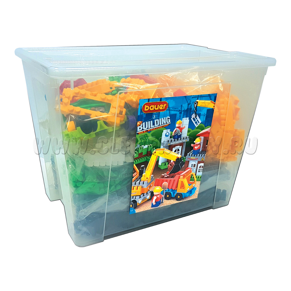 Набор серии «Стройка» совместим с другими наборами от BAUER. В комплект входят: кубики различных цветов и размеров, сборная строительная техника, сборные машинки, фигурки человечков и набор инструментов для них, набор наклеек "Дорожные знаки", элементы декора (дорожные знаки, деревья, светофоры, забор, окна, двери, крыши). Конструктор созданн из безопасного пластика с использованием пищевых красителей.