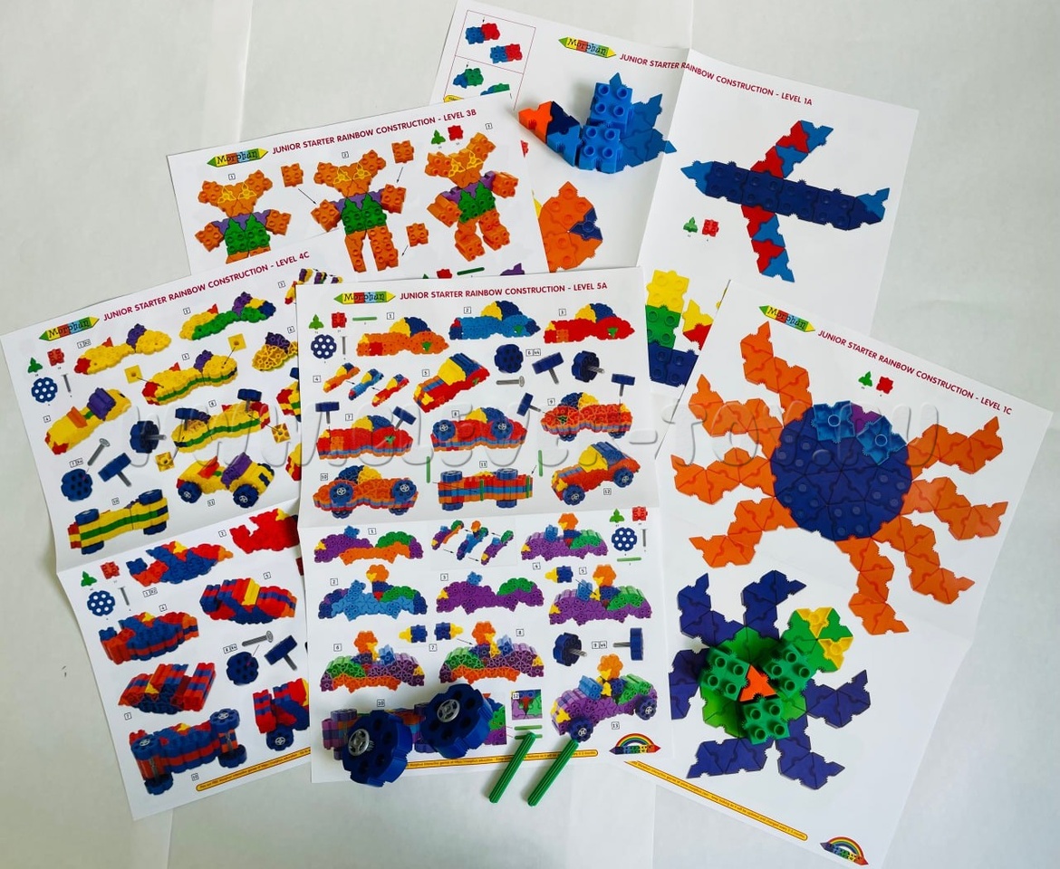 Для сборки более сложных моделей в виде фигурок животных, транспортных средств, в комплектацию конструктора включены подробные красочные инструкции еще 5 уровней сложности, выполненные на листах формата А3.