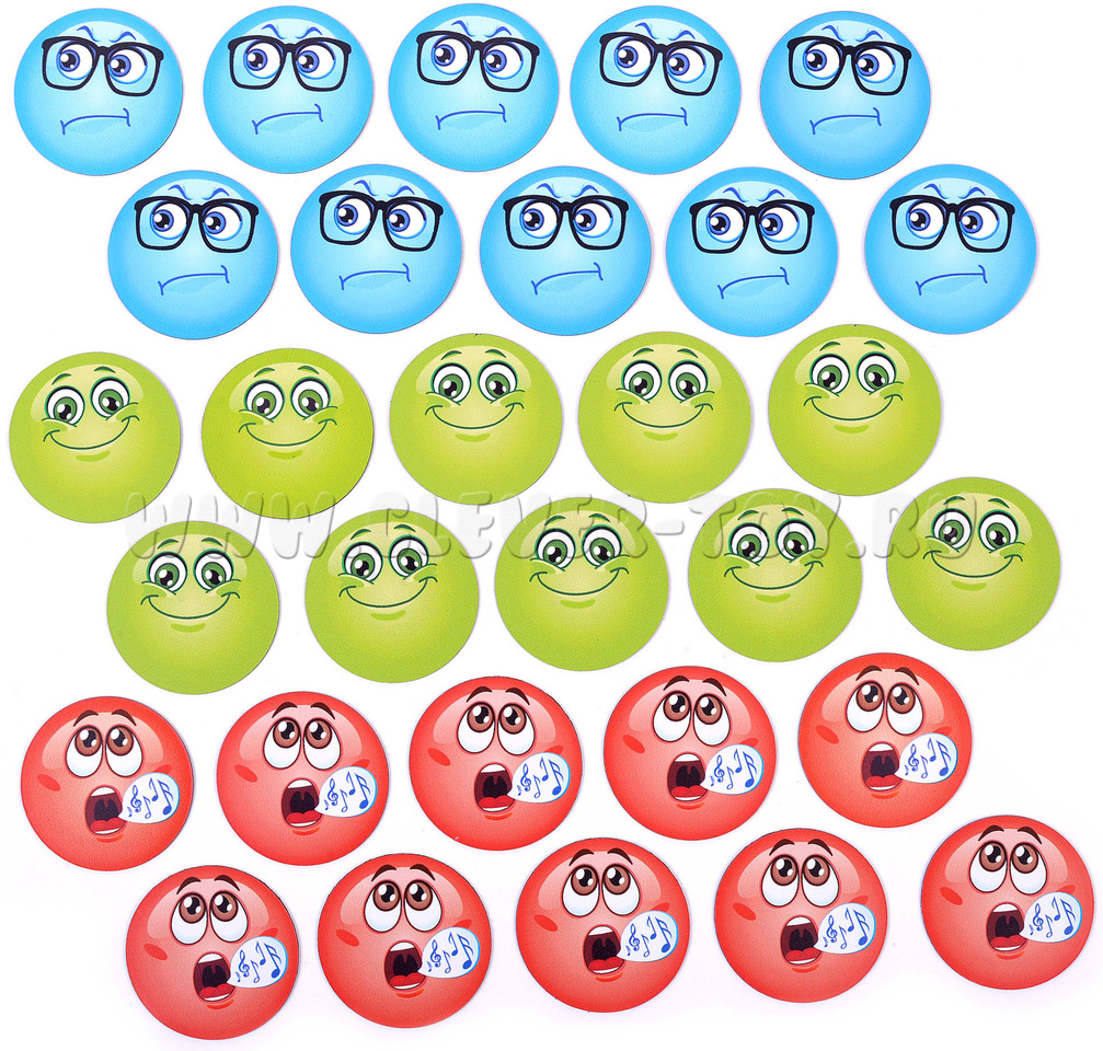 В данном наборе вы найдёте 30 смайлов, по 10 каждого цвета.
