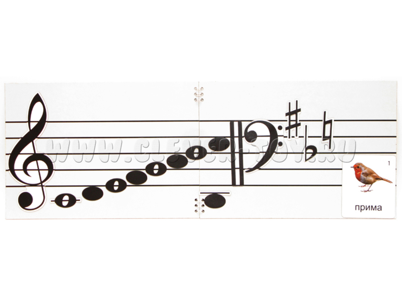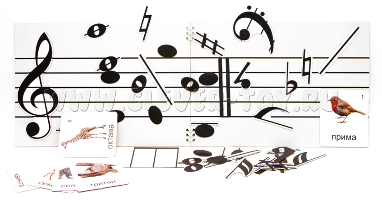 Оно состоит из двух мягких магнитно-маркерных полей формата А4, соединенных друг с другом по короткой стороне (это позволило сделать довольно продолжительный нотный стан) и 125-ти магнитных карточек с различными знаками музыкальной нотации.