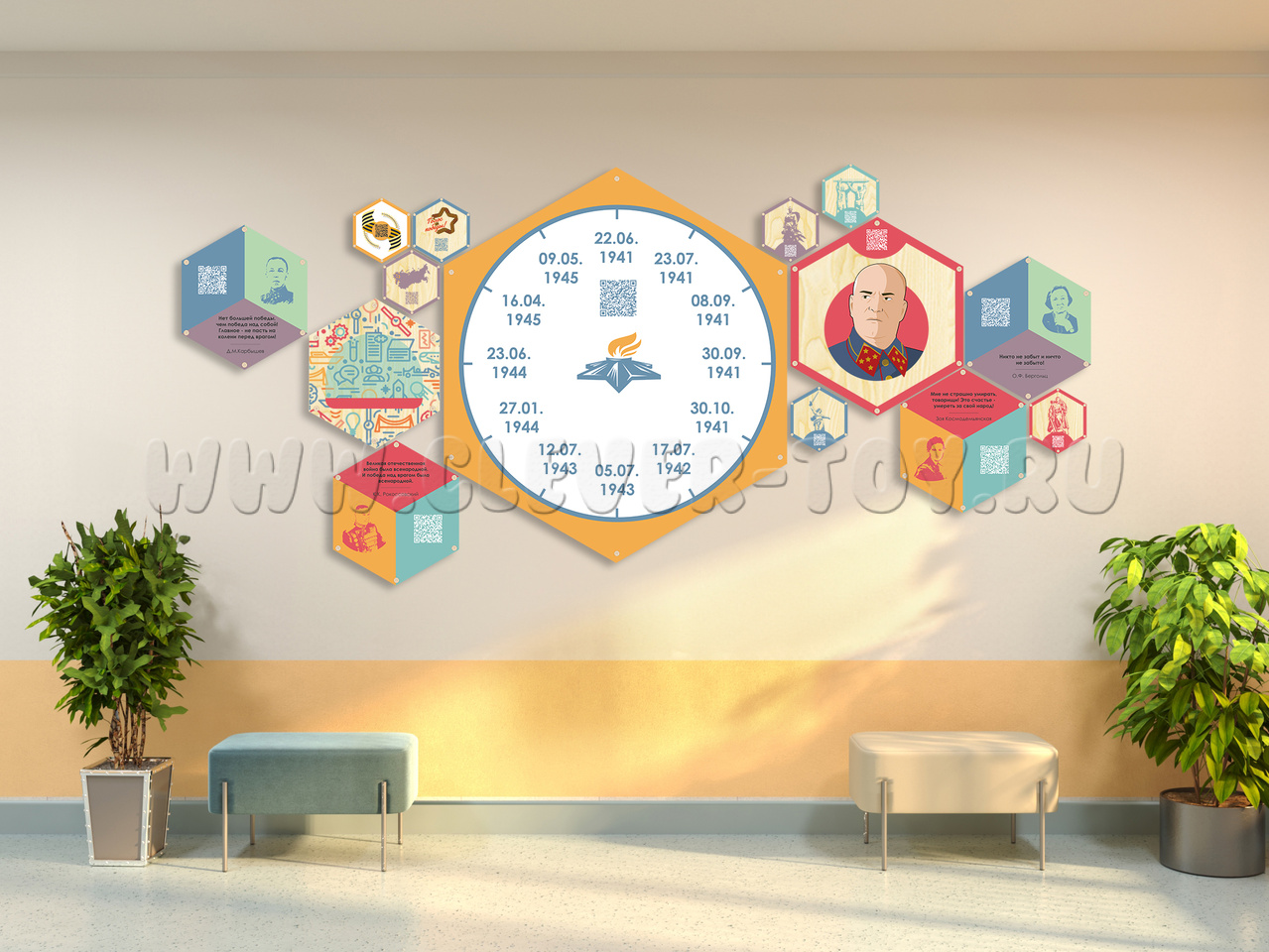 Набор "Великая Отечественная война" представляет собой комплект гексагонов различного размера, которые по-разному комбинируются между собой. Панели можно размещать в классах, холлах, коридорах, зонах отдыха учебного заведения, где они будут выполнять декоративную и обучающую функции, расширять образовательную среду.